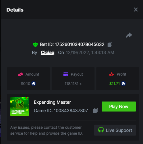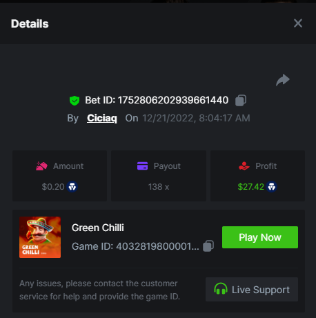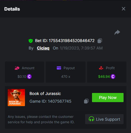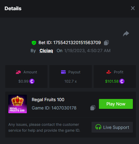 Amigo Monkey - 160.11x https://bc.game/#/sd/111M45NN2J10CZ Blazing Crown - 509x https://bc.game/#/sd/111OO7BAHZI3O3 Book of Jurassic - 470x https://bc.game/#/sd/111P0NJMAP800J Mega Crown - 164.66x https://bc.game/#/sd/111NETDZABK8B7 Regal Fruits 100 - 102.7x https://bc.game/#/sd/111OQ69Y9TN6KZ