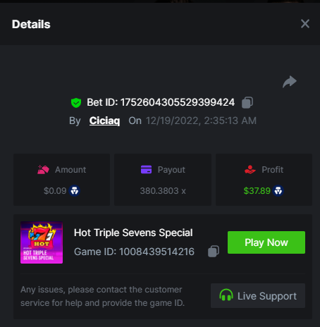 Penalty Shoot Out - Patrick’s Magic Field - Expanding Master - 118.12x https://bc.game/#/sd/10ZJL6CPV3M8ER The Greatest Catch Bonus Buy - 274.27x https://bc.game/#/sd/10ZJJD35VWIZV7 Hot Triple Seven Special - 380.38x https://bc.game/#/sd/10ZJOF6YM6BPCJ