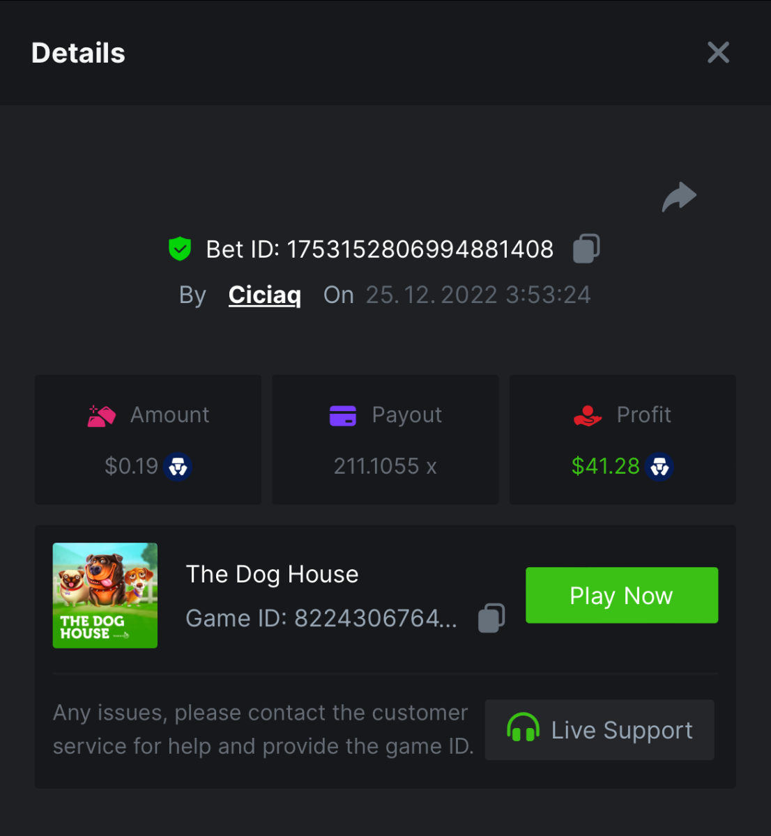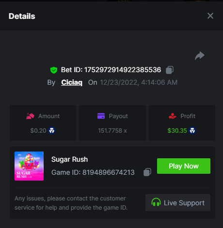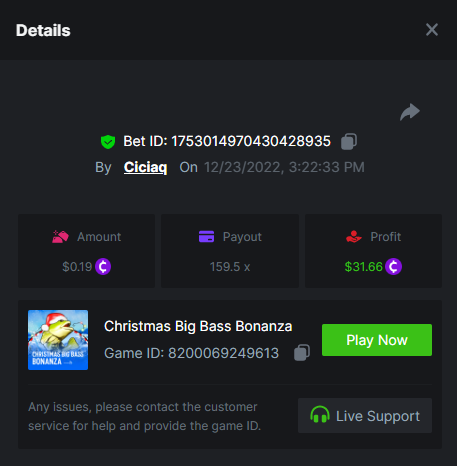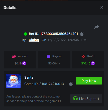 Book of Elves - 120.62x - https://bc.game/#/sd/10ZYH8DLGT55W3 Book of Xmas - 172.67x - https://bc.game/#/sd/10ZYKF4BSFYQS3 Wild Santa II - 21.02x - https://bc.game/#/sd/10ZXHYK4CVZGNN Santa’s Wild Night - 38.41x - https://bc.game/#/sd/10ZXYD8RFBZ5SJ -