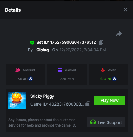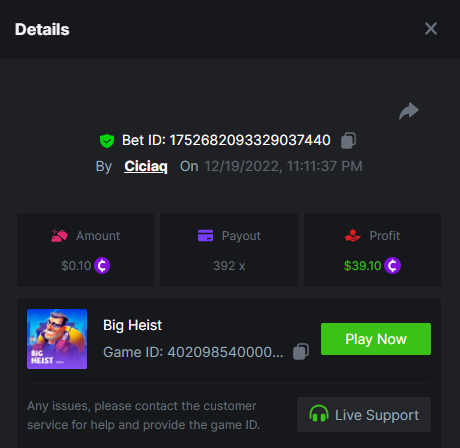 Aztec Fire - 180.95x https://bc.game/#/sd/10ZQ86YI56HFDF Sun of Egypt 3 - 95x https://bc.game/#/sd/10ZMOPVL148X77 Sticky Piggy - 220.25x https://bc.game/#/sd/10ZNWQJ1OELQ8J Big Heist - 392x https://bc.game/#/sd/10ZLSZEBAY239V Green Chilli - 138x https://bc.game/#/sd/10ZP76MH4GKO43