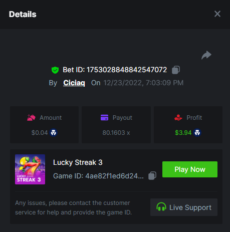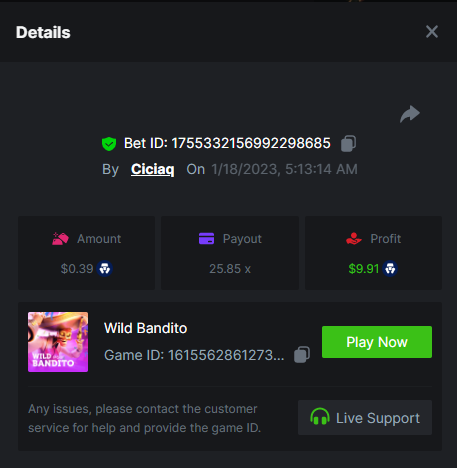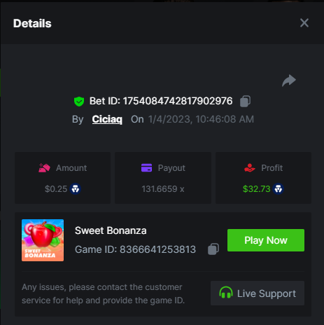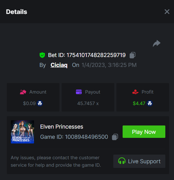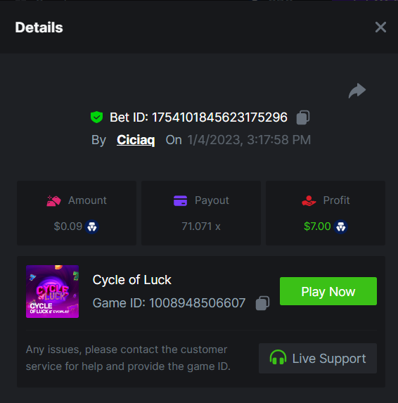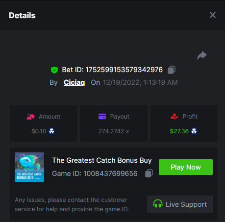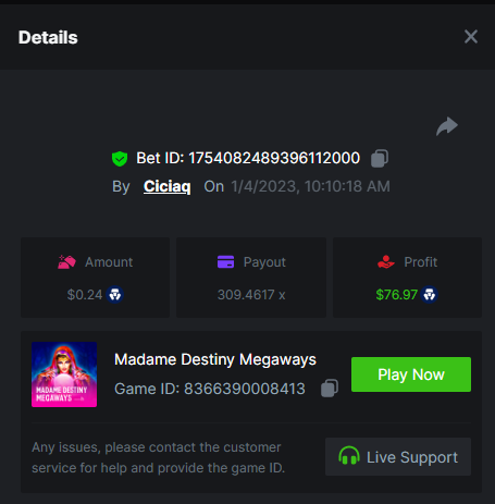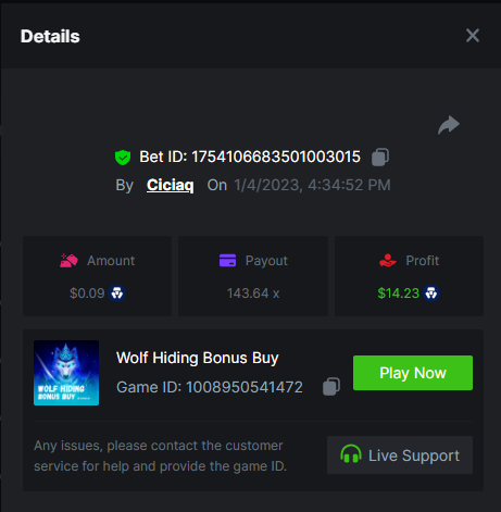 Wolf hiding bonus buy - 143.64x https://bc.game/#/sd/110ORR7MEZ3GUR Elven Princesses - 45.75x https://bc.game/#/sd/110OMVCRMYPBTF Mega Greatest Catch - 100x https://bc.game/#/sd/110OC2PEI3JR4J Cycle Of Luck - 71.07x https://bc.game/#/sd/110OMXKPD9LLOZ Collapsed Castle - 100.1x https://bc.game/#/sd/110NL8OBHCZDHV