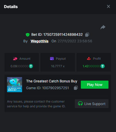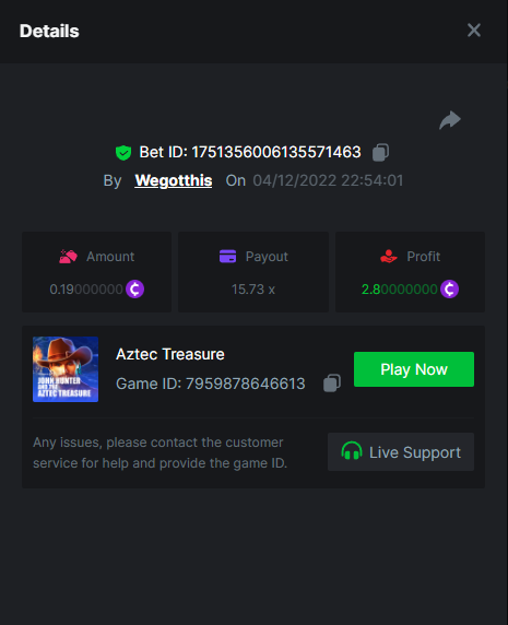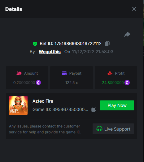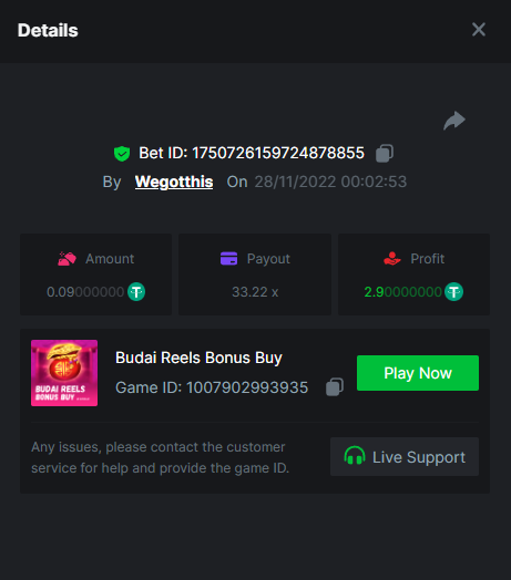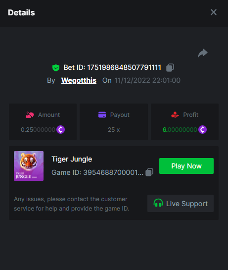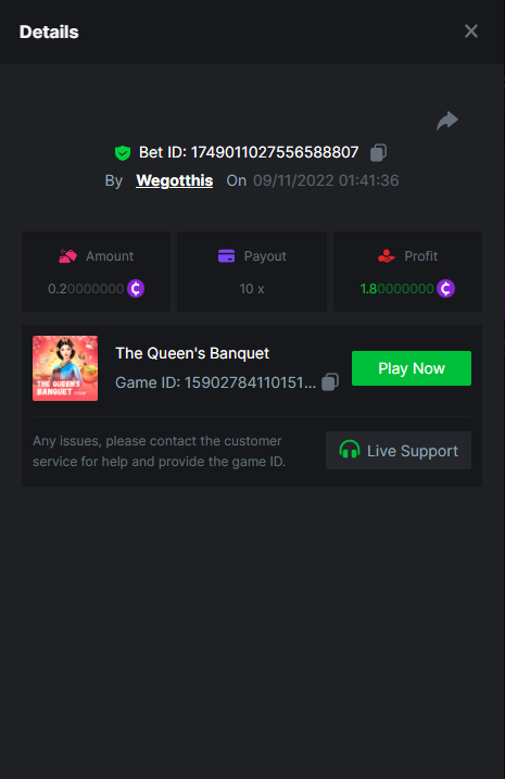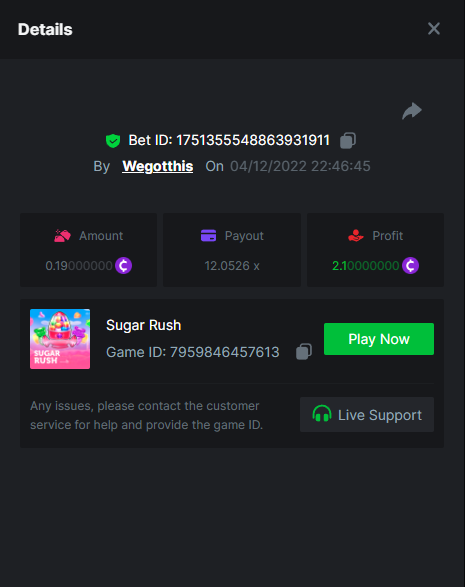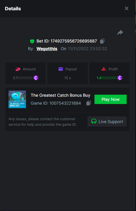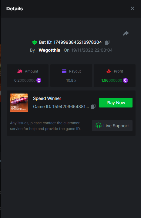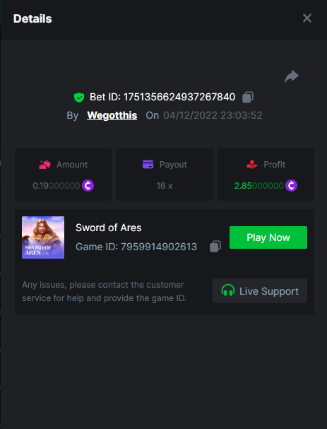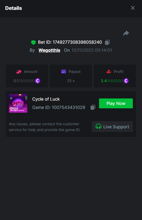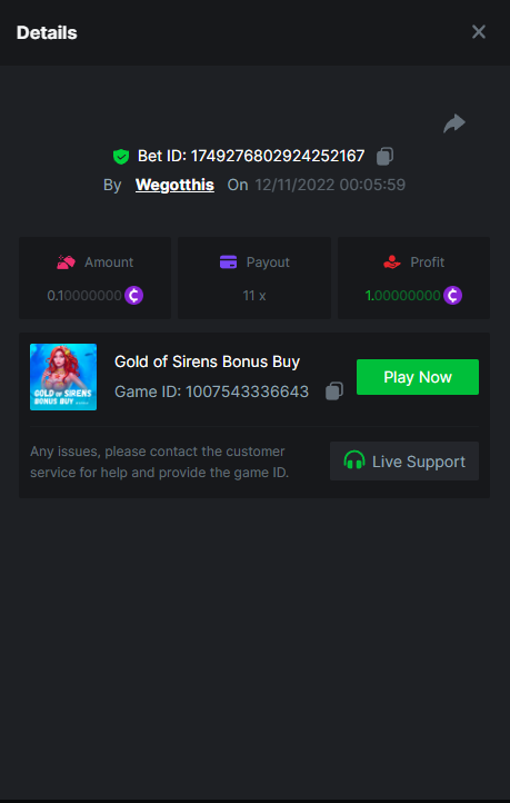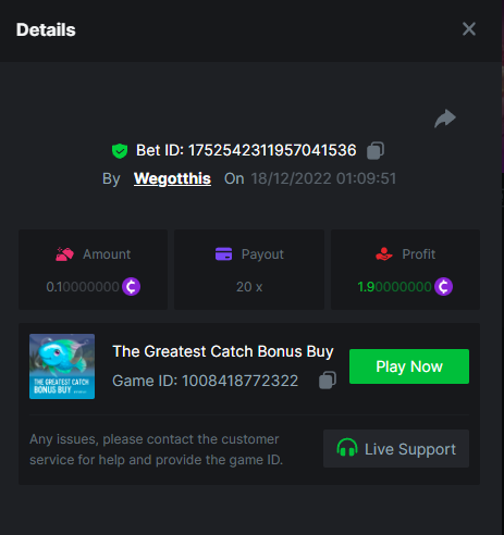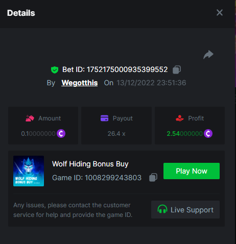 https://bc.game/#/sd/10YLHMO9FMMHW3 https://bc.game/#/sd/10YLI16E0IO0LV https://bc.game/#/sd/10YLIEX5ZDW9OZ I don't know why the bet ID shows 1 cent less per bet, while it's 10 cents on the provider's page. This would have made me eligible for bounty with exactly 50x. Look at screenshot below for example. https://bc.game/#/sd/10YLIV09L2KW7N https://bc.game/#/sd/10YLJADSJL3L77 https://bc.game/#/sd/10YLJI9Y61ZCIB https://bc.game/#/sd/10YLJVIP8441ZN https://bc.game/#/sd/10YLK4I9DYJAJ7 -