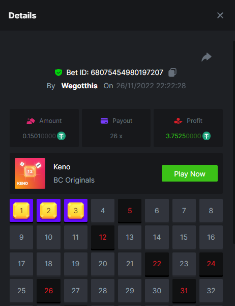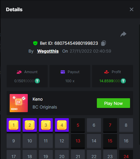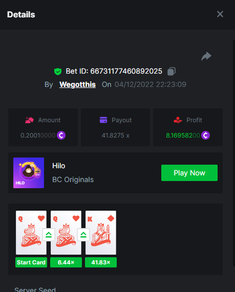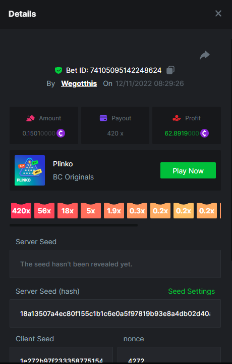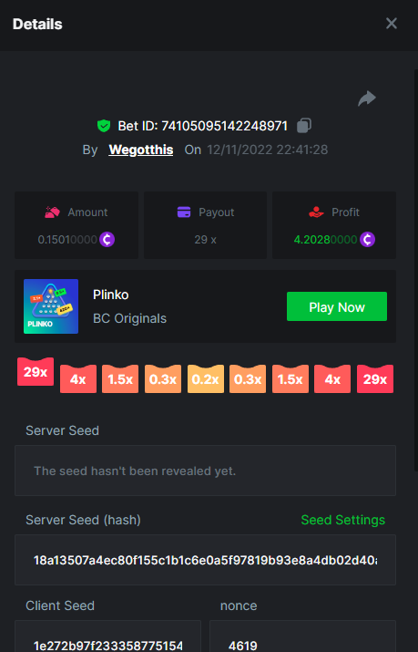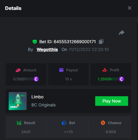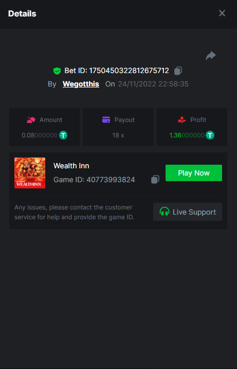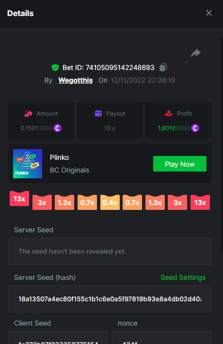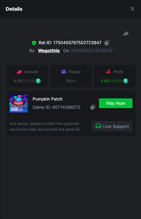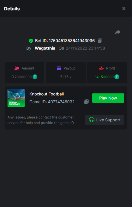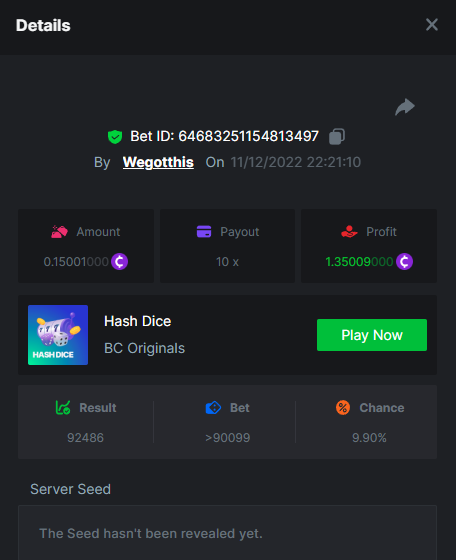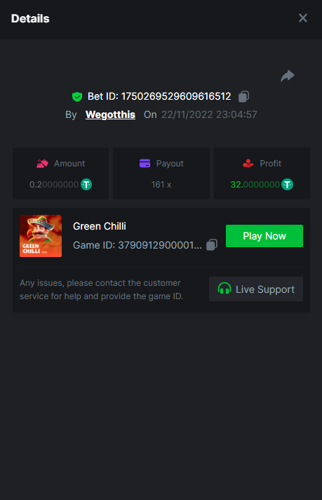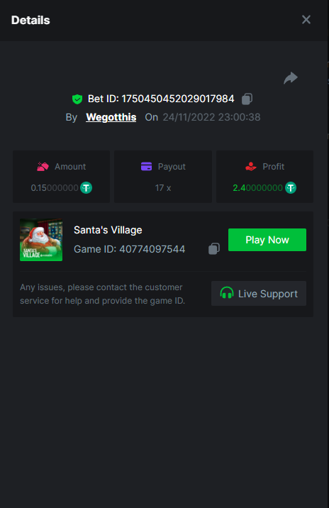 https://bc.game/#/sd/10YLHMO9FMMHW3 https://bc.game/#/sd/10YLI16E0IO0LV https://bc.game/#/sd/10YLIEX5ZDW9OZ I don't know why the bet ID shows 1 cent less per bet, while it's 10 cents on the provider's page. This would have made me eligible for bounty with exactly 50x. Look at screenshot below for example. https://bc.game/#/sd/10YLIV09L2KW7N https://bc.game/#/sd/10YLJADSJL3L77 https://bc.game/#/sd/10YLJI9Y61ZCIB https://bc.game/#/sd/10YLJVIP8441ZN https://bc.game/#/sd/10YLK4I9DYJAJ7 -