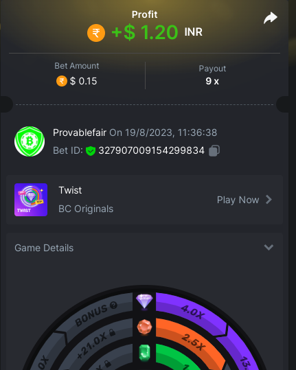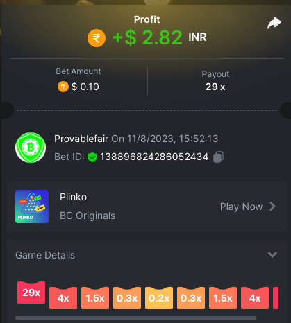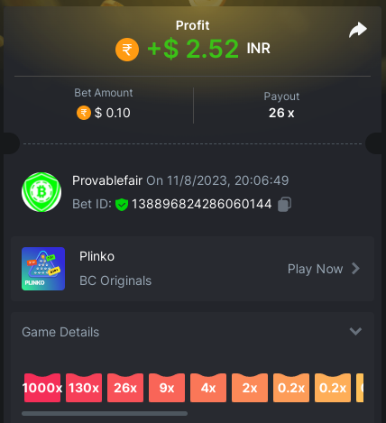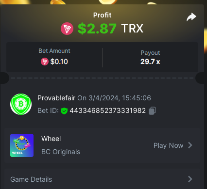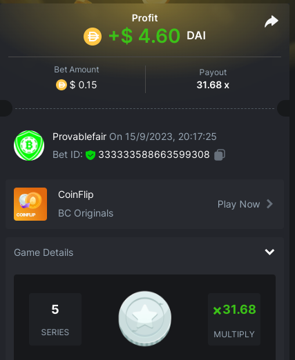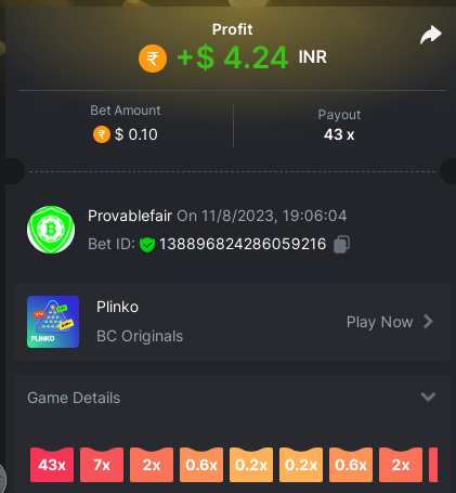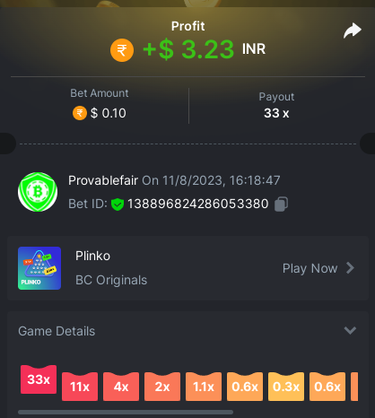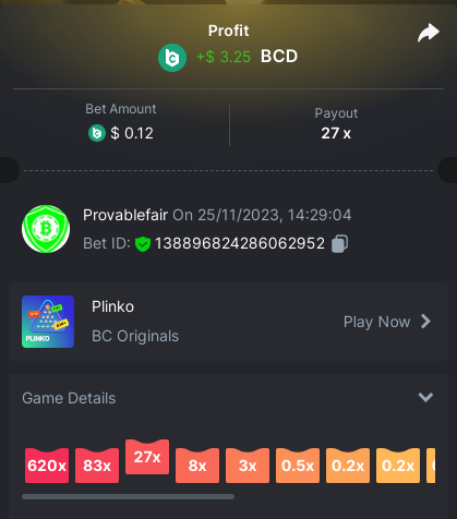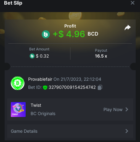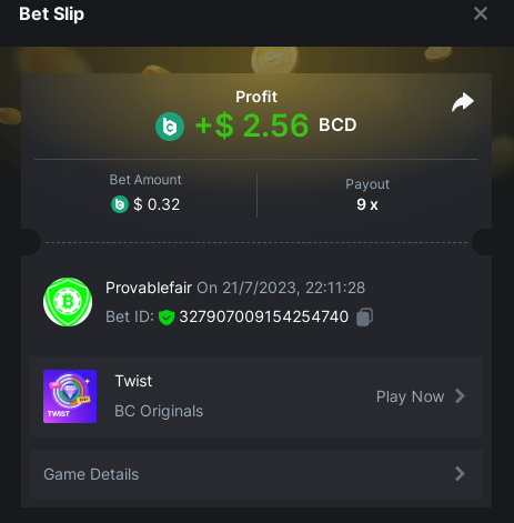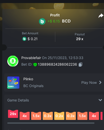 9x 0.32 https://bc.game/#/sd/11EBVJLUGH5GCZ Bet ID:327907009154254740 ----- 12x 0.32$ https://bc.game/#/sd/11EBVNY5LHXTGN Bet ID:327907009154254739 -- 15.5x https://bc.game/#/sd/11EBNUJIV3VEXZ Bet ID: 327907009154252993 ---- 16.5x 0.32$ https://bc.game/#/sd/11EBVQRMJB3NRN Bet ID:327907009154254742 -