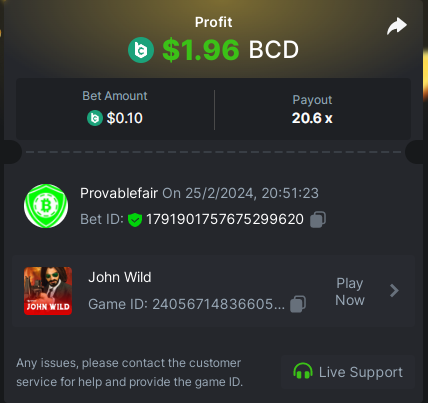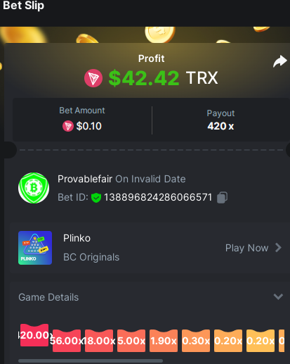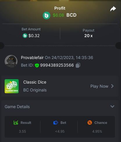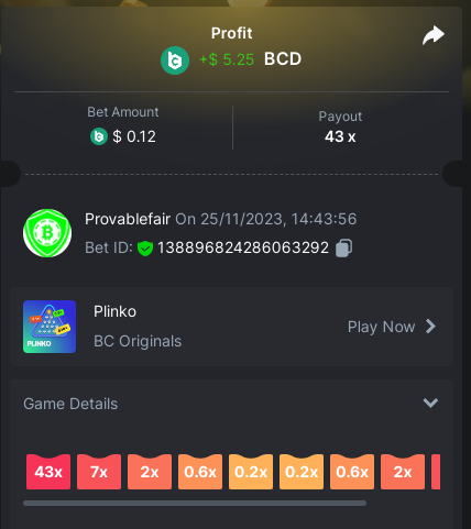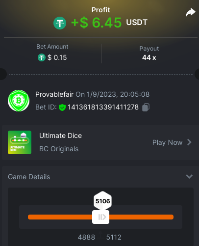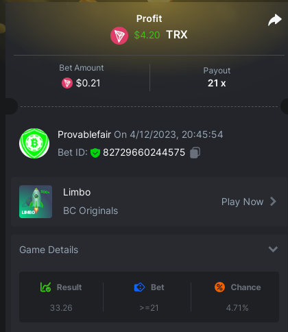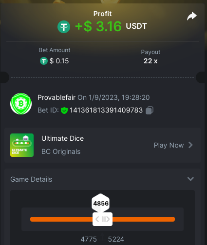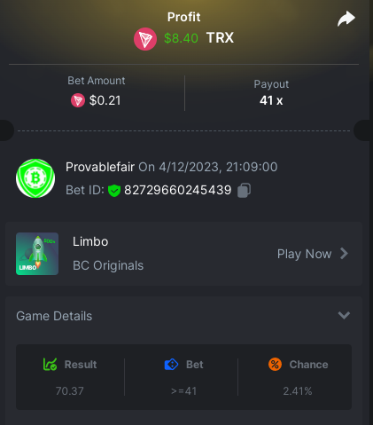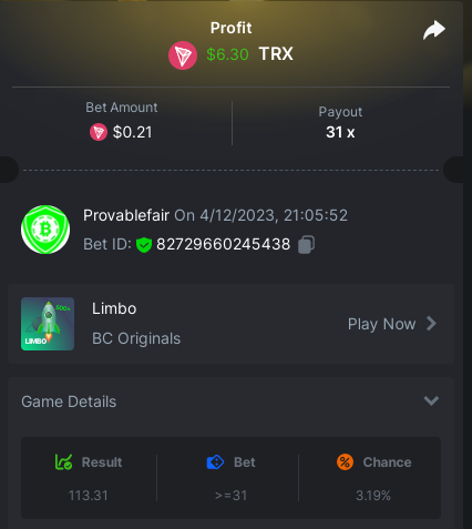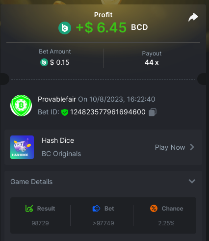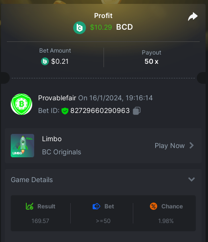 bet 0.21$ - 50x - Hash Dice - https://bc.game/#/sd/11QN6R5L1JDVQJ - Bet ID: 124823577961695244 bet 0.21$ - 50x - Limbo - https://bc.game/#/sd/11QN8527NJ49ZV - Bet ID: 82729660290963