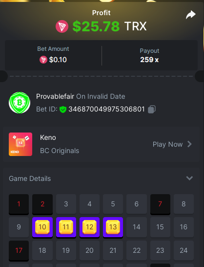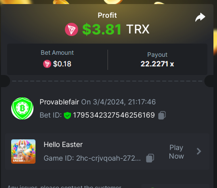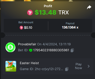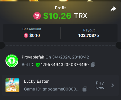 task done 17 out of 30 points Easy 1. Win a Crash bet with a 10x payout. Bet Amount 0.2$ - payout 10x - https://bc.game/#/sd/11W05LAVJ0XRDV - betid 1795325633233020674 2. Get a 10x payout on a Classic Dice bet. Bet amount 0.1$ - Bet ID: 9994389254345 - https://bc.game/#/sd/11W04DAUSPUQLN 3. Get a 10x payout on the Run Away Zumbies. Bet Amount 0.2$ - Payout 80.3106 x - https://bc.game/#/sd/11W0KIE8VXJPMF - Bet ID:1795339805452732712 4. Win a 'Tie' 9x bet on the Baccarat. - bet 0.12$ - https://bc.game/#/sd/11VZYA5O9WTSHN - Bet Id 443334654666211352 5. Get a 20x payout on the John Wild. Bet amount 0.1$ - payout 20.902x - https://bc.game/#/sd/11W0GYKZI9NE6F - Bet ID:1795337202902585386 6. Win a Twist bet on 15.5x payout (3rd Purple Gem). bet 0.1$- 15.5x - https://bc.game/#/sd/11W00W2HE7XUUZ - betid 443343283255509488 7. Win a Sports bet with minimum odds being 1.5x (singles only) 2$ base min amount. Ticket Id 2386880115666727018 - odds 1.871x bet 100 tron (11$+) - 8. Get a minimum 20x multi on BGaming Hello Easter slot. Bet Amount 0.18$ - Payout 22.2271 x - https://bc.game/#/sd/11W0M2A9IMSF3V - Bet ID:1795342327546256169 9. Get a minimum 30x multi on Red Tiger Lucky Easter slot. Bet Amount 0.1$ - Payout 103.7037 x-https://bc.game/#/sd/11W0T1253QL30F - Bet ID: 1795349432350376490 10. 2FA enabled , E-Mail & Phone Number verified. Medium 1. Win a bet in Roulette Single with betting on 0 only (36x). (no spread bets) Bet Amount 0.1$ - payout 36x - https://bc.game/#/sd/11W0G3KI2UCN0B - Bet ID:160147613797056952 2. Get a 76x on Plinko. Bet Amount 0.1$ - Payout 76x -https://bc.game/#/sd/11W0FBW34H0ZNF - Bet ID:138896824286067710 4 Win a Sports bet with minimum odds of 2x (singles only) 2$ base min amount. Ticket Id 2386880698159079982 - odds 2.21x bet 45 tron (5$+) - 8. Get a minimum 90x multi on BGaming Easter Heist slot. Bet Amount $0.10 - Payout 136.1364x - https://bc.game/#/sd/11W2937HDYZ1R7- Bet ID:1795402318880305961 Hard 1. Get a 29.70x on Wheel (30 segments, High risk). Bet Amount 0.1$ - Payout 29.7x - https://bc.game/#/sd/11W01J42QJW7EV Bet ID: 443346852373331982 2. Get a 420x on Plinko (14 rows, High risk). Bet Amount 0.1$ - Payout 420x - https://bc.game/#/sd/11W0CA75CTHUGR - Bet ID: 138896824286066571 7. Win a bet on Keno Single by selecting numbers 10, 11, 12 and 13, High risk, (259.00x). Bet Amount 0.1$ - payout 259x - https://bc.game/#/sd/11W08UETLZH4BV - BetID :346870049975306801 -