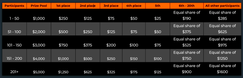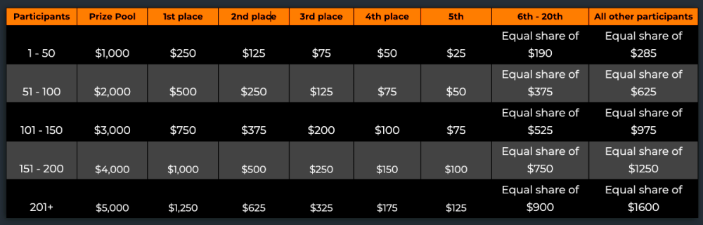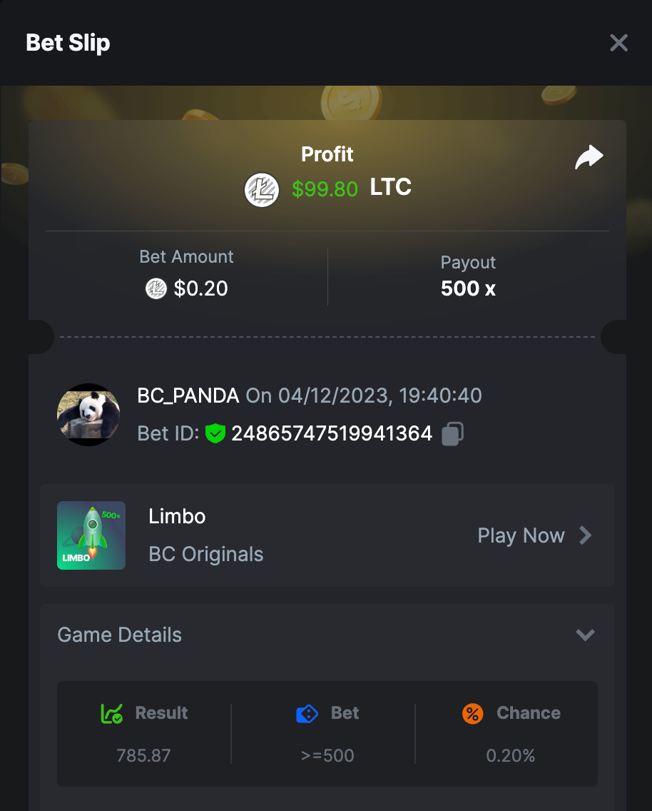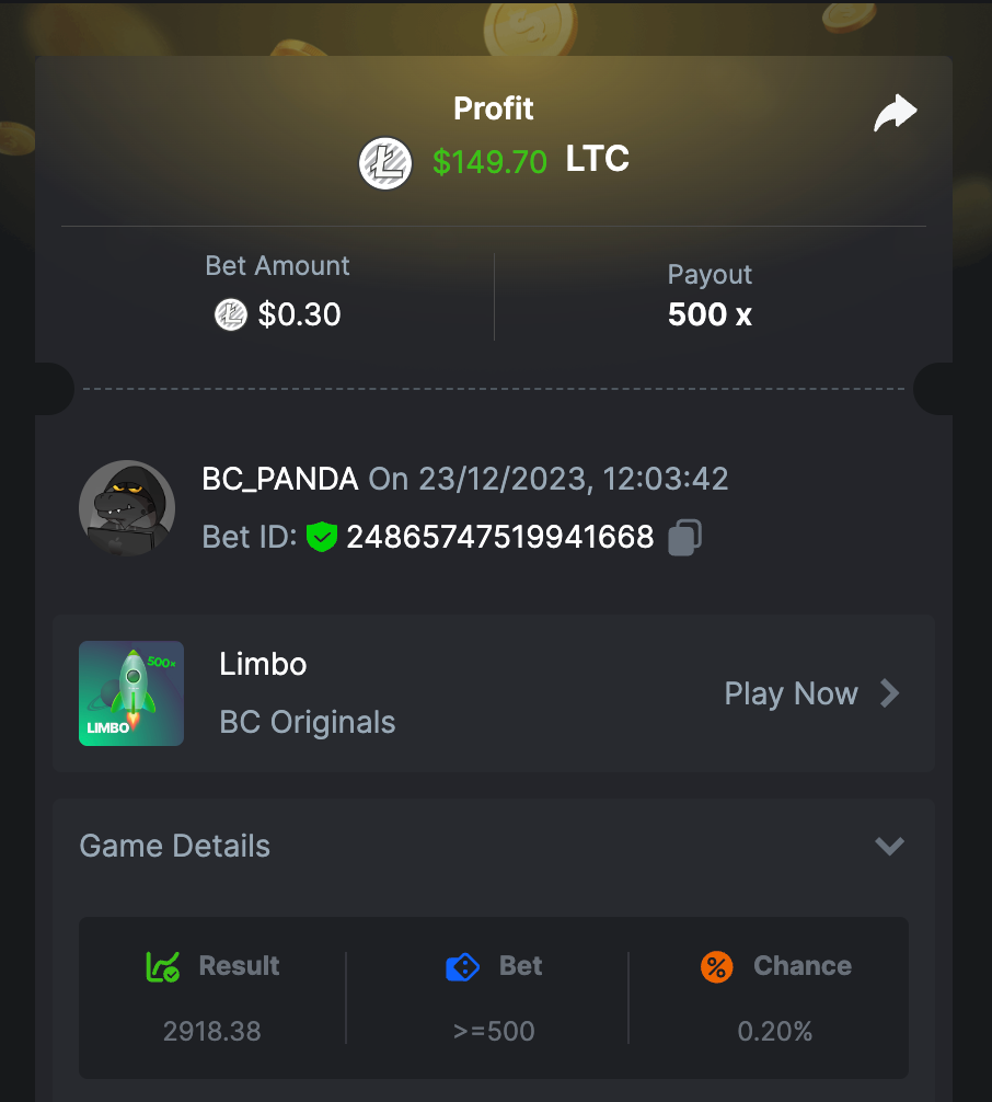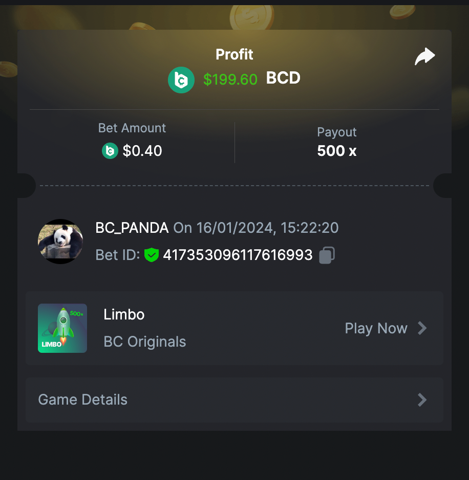 9. $5k Prestige Limbo Challenge #109 DURATION: 4th December - 11th December 05:30 pm UTC This weeks Prestige Challenge is back with your favourite game Limbo! Take part in this amazing yet challenging event to split prizes worth $5,000! Please check below the all new prize pool distribution table to understand more about it. We will be trying this new way for a while and depending on the participations and feedback we will further increase our pools. What's the Challenge? Win the highest multiplier you can on on BC.Game's in-house game, Limbo. If there is a tie, the player with the higher average bet amount (in USD) shall be the winner. If there is a tie in the amount and payout, the one who posted or edited his post first will be considered in the Ranking. How to Enter To enter, copy the link of the bet you'd like to submit. Once you've copied it, paste it as a reply to this thread like so: Link: https://bc.game/#/sd/11NOEOJIJDHGVJ In the same post, upload a screenshot of your win by clicking the game ID WITH VIEW IN USD mode ENABLED (accessible at the bottom of dropdown menu for your wallet up top. This way, we can ensure that your bet indeed met the minimum requirement at the time of placing it: Link: https://bc.game/#/sd/11NOEOJIJDHGVJ Minimum VIP Minimum VIP 4 with phone verified will be eligible! Minimum Payouts Minimum payout to qualify is 20x Minimum Bet Size $0.20 USD equivalent Eligible Coins All cryptocurrencies are eligible (excepting JB) Available Prizes GENERAL TERMS Please combine all of your hits together in a SINGLE post. Edit your existing post for additional hits, don't create a new post. Each eligible entry must have the Bet Slip URL, failure to include it will disqualify participation in the event. Bet Slip image is not mandatory. Bets must be posted within 24 hours of placing bet in order to keep things fair for everyone. Bets must be made during the specified time window stated above. This thread will lock automatically when the time period is over. One (1) entry per household. Anyone found attempting to win multiple prizes will be disqualified from this challenge as well as all future challenges. Failure to follow instructions will result in your submission being null and void. By entering this challenge, you acknowledge that BC.Game has the final decision on results and placement. Payouts will be distributed after the event is finished. Please note that it could take anywhere between 24 hours to 7 days after the completion of the event.