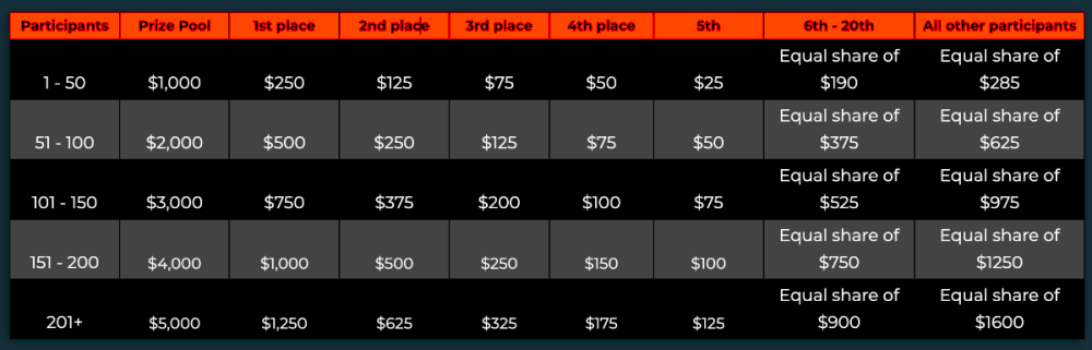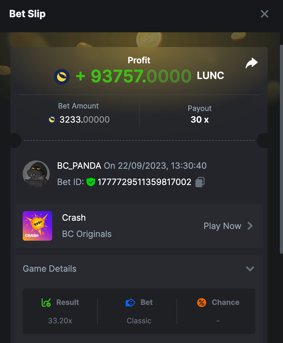 11. $5k Prestige Crash Challenge #107 DURATION: 22nd SEP - 29th SEP 13:20 pm UTC Dear esteemed VIP members, it's our pleasure to welcome you once again for an exhilarating week of contests and fervor from 22nd September to 29th September. Gear up for the much-awaited Prestige Challenge, a platform to showcase and push your Crash skills to the pinnacle. The focus of this week's tournament is on attaining the top multipliers, guaranteeing a heart-racing encounter unlike any other. The rules are clear-cut, and with a prize pool that's too tempting to resist, be assured that the competition is fiercer than ever. Let's dive into this remarkable challenge without any further ado. Kindly peruse the attached terms and conditions with utmost diligence. What's the Challenge? Win the highest multiplier you can on BC.Game's in-house game, Crash. If there is a tie, the player with the higher average bet amount (in USD) shall be the winner. If there is a tie in the amount and payout, the one who posted or edited his post first will be considered in the Ranking. How to Enter To enter, copy the link of the bet you'd like to submit. Once you've copied it, paste it as a reply to this thread like so: Link: https://bc.game/#/sd/11IMVWRRUCY1XZ In the same post, upload a screenshot of your win by clicking the game ID WITH VIEW IN USD mode ENABLED (accessible at the bottom of dropdown menu for your wallet up top. This way, we can ensure that your bet indeed met the minimum requirement at the time of placing it: Link: https://bc.game/#/sd/11IMVWRRUCY1XZ Minimum VIP Minimum VIP 4 with phone verified will be eligible! Minimum Payouts Minimum payout to qualify is 20x Minimum Bet Size $0.2 USD equivalent Eligible Coins All cryptocurrencies are eligible (excepting JB) Available Prizes GENERAL TERMS Please combine all of your hits together in a SINGLE post. Edit your existing post for additional hits, don't create a new post. Each eligible entry must have the Bet Slip URL, failure to include it will disqualify participation in the event. Bet Slip image is not mandatory. Bets must be posted within 24 hours of placing bet in order to keep things fair for everyone. Bets must be made during the specified time window stated above. This thread will lock automatically when the time period is over. One (1) entry per household. Anyone found attempting to win multiple prizes will be disqualified from this challenge as well as all future challenges. Failure to follow instructions will result in your submission being null and void. By entering this challenge, you acknowledge that BC.Game has the final decision on results and placement. Payouts will be distributed after the event is finished. Please note that it could take anywhere between 24 hours to 7 days after the completion of the event.