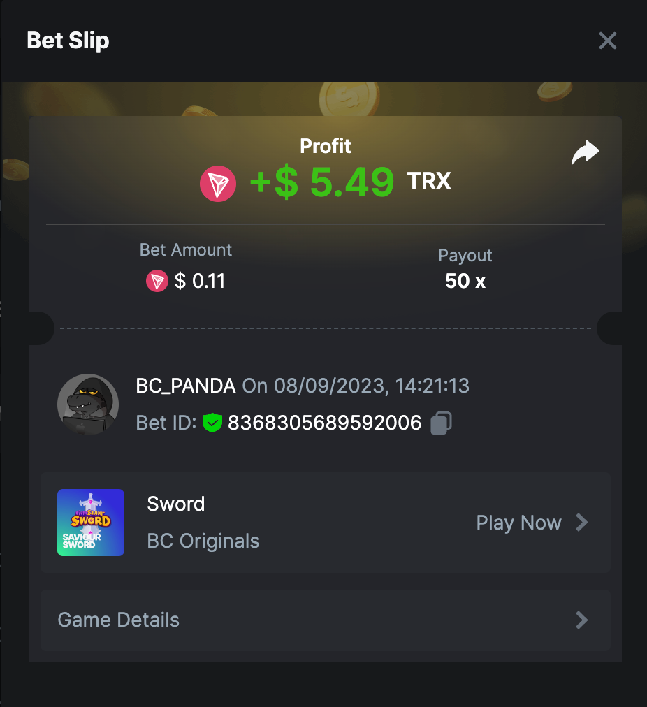 13. $5k Prestige Saviour Sword Challenge #105 DURATION: 8th SEP - 15th SEP 13:20 pm UTC Greetings, BC.Game enthusiasts! The thrill of wielding the sword intensifies! Step into the Saviour Sword Challenge, an epic battleground where skill meets destiny, and vie for a chance to emerge victorious with honor and rewards. Happening from 8th September to 15th September, this is your golden opportunity to demonstrate your expertise in Saviour Sword and share a grand prize pool of $5,000! Whether you're a master swordsman or a newbie seeking an adventure, this week is packed with unparalleled excitement and bountiful rewards. So, prepare your strategies, aim for the top spots, and may fortune accompany your every swing! Let's conquer the leaderboard! What's the Challenge? Get the highest multiplier you can on BC.Game's in-house slot, Saviour Sword. In case of a tie, the participant with a higher bet amount will be given the advantage. If there is a tie in the amount and payout, the one who posted or edited his post first will be considered in the Ranking. How to Enter To enter, copy the link of the bet you'd like to submit. Once you've copied it, paste it as a reply to this thread like so: Link: https://bc.game/#/sd/11HOA0U4BN95W7 In the same post, upload a screenshot of your win by clicking the game ID WITH VIEW IN USD mode ENABLED (accessible at the bottom of dropdown menu for your wallet up top. This way, we can ensure that your bet indeed met the minimum requirement at the time of placing it: Link: https://bc.game/#/sd/11HOA0U4BN95W7 Minimum VIP Minimum VIP 4 with phone verified will be eligible! Minimum Payout Minimum payout to qualify is 10x Minimum Bet Size $0.08 USD equivalent Eligible Coins All coins are eligible (excepting JB, and BCL) Available Prizes GENERAL TERMS Please combine all of your hits together in a SINGLE post. Edit your existing post for additional hits, don't create a new post. Bets must be posted within 24 hours of placing bet in order to keep things fair for everyone. Bets must be made during the specified time window stated above. This thread will lock automatically when the time period is over. One (1) entry per household. Anyone found attempting to win multiple prizes will be disqualified from this challenge as well as all future challenges. Furthermore, you will go on the WALL OF SHAME for all to see that you are a scam. Scam 4 Scam. Failure to follow instructions will result in your submission being null and void. By entering this challenge, you acknowledge that BC.Game has the final decision on results and placement. Payouts will be distributed after the event is finished. Please note that it could take up to 7 days after the completion of the event.