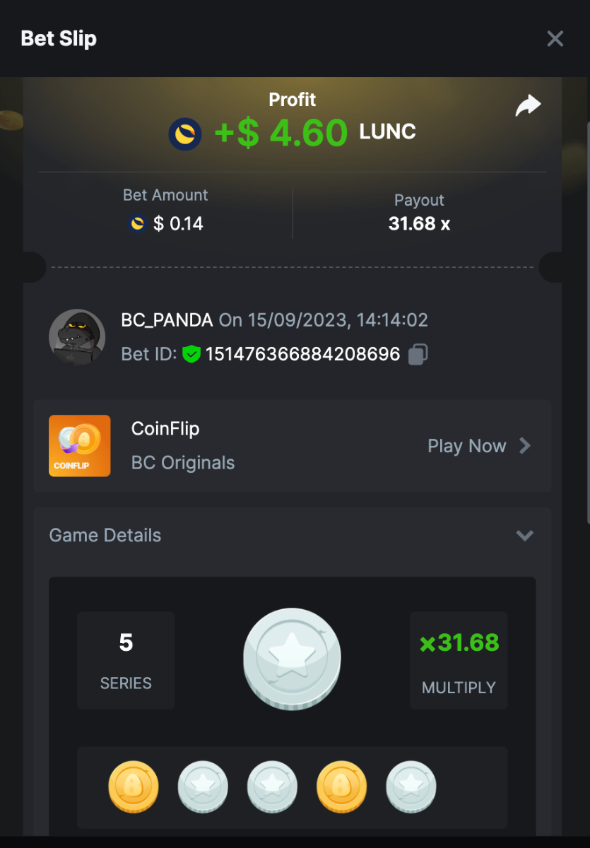 12. $5k Prestige Coinflip Challenge #106 DURATION: 15th SEP - 22th SEP 13:20 pm UTC Greetings, BC.Game enthusiasts! From 15th to 22nd September, step into the Coinflip Conquest Challenge! Whether you're a seasoned flipper or a newcomer, showcase your knack for hitting that 31.68x multiplier across 5 flips. A hefty $5,000 prize pool awaits. Flip wisely, target the leaderboard, and let fortune favor your coin's landing! What's the Challenge? Win the highest multiplier you can on in-house Coinflip (Most flips in a row). If there is a tie, the player with the higher average bet amount (in USD) shall be the winner. If there is a tie in the amount and payout, the one who posted or edited his post first will be considered in the Ranking. How to Enter To enter, copy the link of the bet you'd like to submit. Once you've copied it, paste it as a reply to this thread like so: Link: https://bc.game/#/sd/11I5M1390NB8QV In the same post, upload a screenshot of your win by clicking the game ID WITH VIEW IN USD mode ENABLED (accessible at the bottom of dropdown menu for your wallet up top. This way, we can ensure that your bet indeed met the minimum requirement at the time of placing it: Link: https://bc.game/#/sd/11I5M1390NB8QV Minimum VIP Minimum VIP 4 with phone verified will be eligible! Minimum Payouts Minimum payout to qualify is 31.68x (5 Flips) Minimum Bet Size $0.15 USD equivalent Eligible Coins All cryptocurrencies are eligible (excepting JB) Available Prizes GENERAL TERMS Please combine all of your hits together in a SINGLE post. Edit your existing post for additional hits, don't create a new post. Each eligible entry must have the Bet Slip URL, failure to include it will disqualify participation in the event. Bet Slip image is not mandatory. Bets must be posted within 24 hours of placing bet in order to keep things fair for everyone. Bets must be made during the specified time window stated above. This thread will lock automatically when the time period is over. One (1) entry per household. Anyone found attempting to win multiple prizes will be disqualified from this challenge as well as all future challenges. Failure to follow instructions will result in your submission being null and void. By entering this challenge, you acknowledge that BC.Game has the final decision on results and placement. Payouts will be distributed after the event is finished. Please note that it could take anywhere between 24 hours to 7 days after the completion of the event.