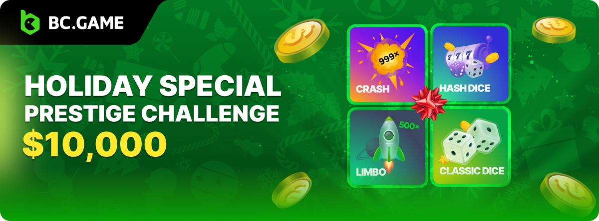 8. $10k HOLIDAY SPECIAL PRESTIGE CHALLENGE DURATION: 23rd December – 2nd January, 08:30 am UTC Celebrate the festive season with BC.GAME's "Christmas & New Year Special Prestige Challenge"! Dive into the holiday spirit with our exciting lineup of games: Crash, Limbo, Hash Dice, and Classic Dice. This special event is your chance to end the year on a high note and ring in the new year with spectacular wins! Join us on a festive gaming spree where the excitement never ends. Challenge yourself in any of our four featured games and aim for the highest multipliers. It's a holiday extravaganza with a competitive twist! What's the Challenge? Achieve the highest multiplier possible in our exclusive games: Crash | Limbo | Classic Dice | Hash Dice In the event of a tie, the winner will be determined by the higher average bet amount (in USD). Should there be a tie in both the amount and payout, priority in the ranking will be given to the player who first posted or edited their entry. How to Enter To enter, copy the link to the bet you'd like to submit. Once you've copied it, paste it as a reply to this thread, like so: Link: https://bc.game/#/sd/11OYP94GH5IXXJ In the same post, upload a screenshot of your win by clicking the game ID WITH VIEW IN USD mode ENABLED (accessible at the bottom of the drop-down menu for your wallet up top). This way, we can ensure that your bet indeed meets the minimum requirement at the time of placing it: Minimum VIP A minimum of Level VIP 4 with phone verified will be eligible! Minimum Payouts The minimum payout to qualify is 20x Minimum Bet Size $0.30 USD equivalent Eligible Coins All cryptocurrencies are eligible (excepting JB) Available Prizes GENERAL TERMS Please combine all of your hits into a single post. Edit your existing post for additional hits; don't create a new post. Each eligible entry must have the Bet Slip URL; failure to include it will disqualify participation in the event. The Bet Slip image is not mandatory. Bets must be posted within 24 hours of placing the bet in order to keep things fair for everyone. Bets must be made during the specified time window stated above. This thread will lock automatically when the time period is over. One (1) entry per household. Anyone found attempting to win multiple prizes will be disqualified from this challenge as well as all future challenges. Failure to follow the instructions will result in your submission being null and void. By entering this challenge, you acknowledge that BC.Game has the final say on results and placement. Payouts will be distributed after the event is finished. Please note that it could take anywhere from 24 hours to 7 days after the completion of the event.