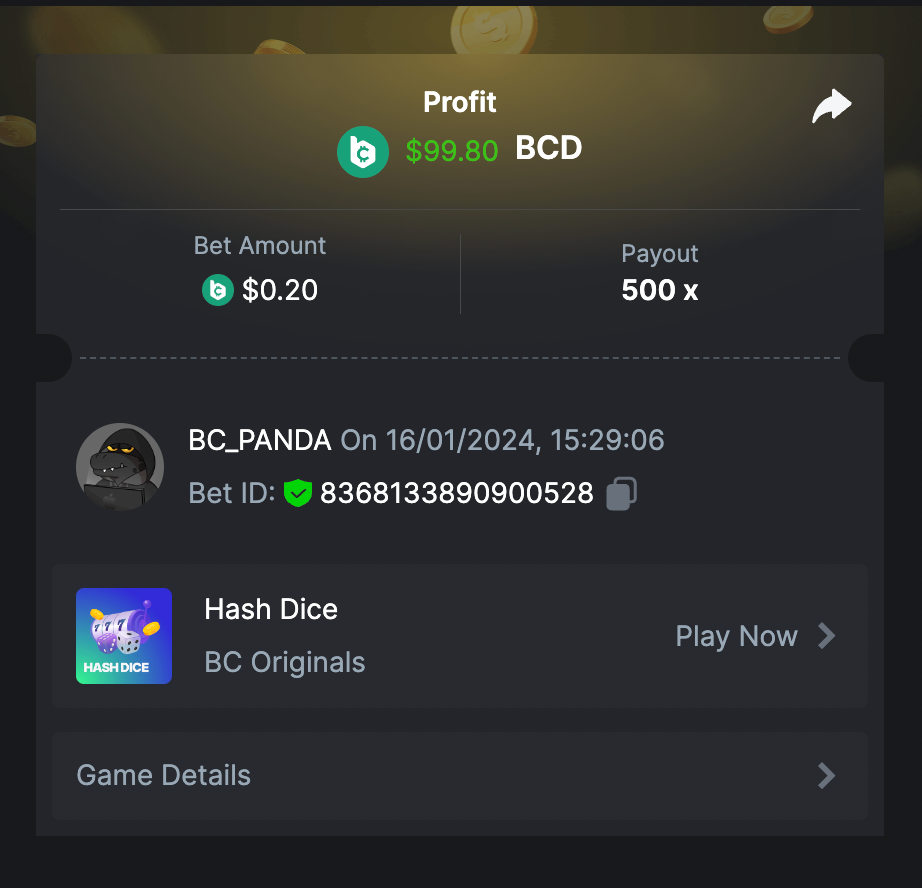 14. $5k Prestige Ultimate Dice Challenge #104 DURATION: 1st SEP - 8th SEP 13:20 pm UTC Greetings, BC.Game enthusiasts! The thrill of rolling the dice just got even more exhilarating! Dive into the "$5k Prestige Ultimate Dice Challenge #104", a spectacular arena where precision meets luck, and stand a chance to bask in glory and rewards. Running from 1st September to 8th September, this is your golden opportunity to showcase your prowess in Ultimate Dice and share a grand prize pool worth $5,000! Whether you're a seasoned player or just looking for a new challenge, this week promises unforgettable excitement and potentially handsome rewards. So, gear up, aim for those multipliers, and may fortune favor your rolls! Let's roll to victory! What's the Challenge? Complete as many of the following 20 multipliers on our in-house Ultimate Dice. Must be a winning bet. | 11x | 22x | 33x | 44x | 55x | 66x | 76.7441x | 87.6106x | 99x | 150x | 220x | 300x | 396x | 550x | 825x | 900x | 1100x | 2475x | 3300x | 4950x | Each multiplier you hit above counts as 1 point (Maximum 1 point for each multiplier). If there is a tie, the player with the higher average bet amount (in USD) shall be the winner. How to Enter To enter, copy the link of the bet you'd like to submit. Once you've copied it, paste it as a reply to this thread like so: Link: https://bc.game/#/sd/11H78LROL96057 In the same post, upload a screenshot of your win by clicking the game ID WITH VIEW IN USD mode ENABLED (accessible at the bottom of dropdown menu for your wallet up top. This way, we can ensure that your bet indeed met the minimum requirement at the time of placing it: Link: https://bc.game/#/sd/11H78LROL96057 Minimum VIP Minimum VIP 4 with phone verified will be eligible! Minimum Payouts Hit at least 4 payouts to qualify Minimum Bet Size $0.15 USD equivalent Eligible Coins All cryptocurrencies are eligible (excepting JB, and BCL) Available Prizes GENERAL TERMS Please combine all of your hits together in a SINGLE post. Edit your existing post for additional hits, don't create a new post. Bets must be posted within 24 hours of placing bet in order to keep things fair for everyone. Bets must be made during the specified time window stated above. This thread will lock automatically when the time period is over. One (1) entry per household. Anyone found attempting to win multiple prizes will be disqualified from this challenge as well as all future challenges. Failure to follow instructions will result in your submission being null and void. By entering this challenge, you acknowledge that BC.Game has the final decision on results and placement. Payouts will be distributed after the event is finished. Please note that it could take anywhere between 24 hours to 7 days after the completion of the event.