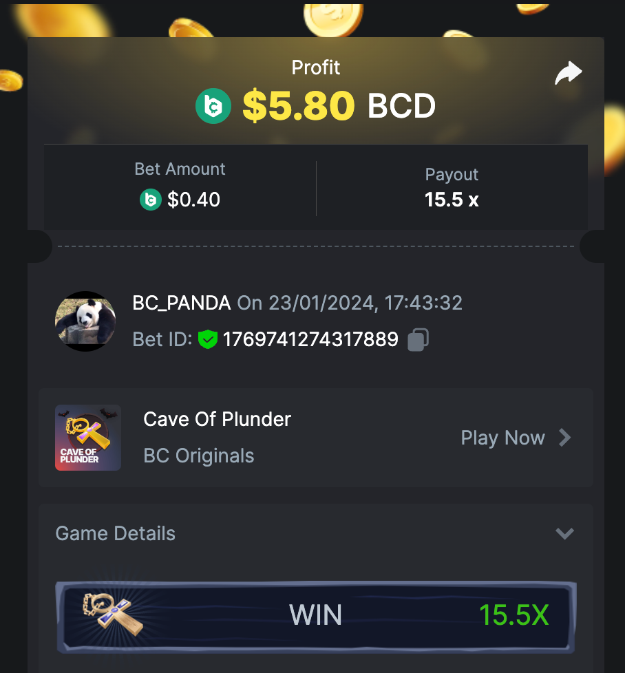 6. $5,000 EXCLUSIVE PRESTIGE CHALLENGE #111 DURATION: 23rd JAN - 30th JAN 14:30 UTC Get ready for the Prestige Challenge featuring the highly anticipated game CAVE OF PLUNDER! Dive into this thrilling event from January 23 to January 30, ending at 14:30 UTC, and compete for a share of the $5,000 prize pool. Make sure to check all the terms to learn how you can be a part of this exciting challenge. Wishing you the best of luck! What's the Challenge? Capture a multiplier - 15.5x or higher on the Cave of Plunder Game. Make sure you get your multiplier captured on my bets section. In case of a tie in multipliers, ranking is based on higher average bet amounts (USD). If still tied, the first to post or edit their entry will be prioritized in the ranking. How to Enter To enter, copy the link of the bet you'd like to submit. Once you've copied it, paste it as a reply to this thread like so: Link: https://bc.game/#/sd/11R44BMJQJ0TI3 In the same post, upload a screenshot of your win by clicking the game ID WITH VIEW IN USD mode ENABLED (accessible at the bottom of dropdown menu for your wallet up top. This way, we can ensure that your bet indeed met the minimum requirement at the time of placing it: Link: https://bc.game/#/sd/11R44BMJQJ0TI3 Minimum VIP Minimum VIP 4 with phone verified will be eligible! Minimum Payouts The minimum payout to qualify is 15.5x Minimum Bet Size $0.4 USD equivalent Eligible Coins All cryptocurrencies are eligible (excepting JB) Available Prizes GENERAL TERMS Please combine all of your hits into a single post. Edit your existing post for additional hits; don't create a new post. Each eligible entry must have the Bet Slip URL; failure to include it will disqualify participation in the event. The Bet Slip image is not mandatory. Bets must be posted within 24 hours of placing the bet in order to keep things fair for everyone. Bets must be made during the specified time window stated above. This thread will lock automatically when the time period is over. One (1) entry per household. Anyone found attempting to win multiple prizes will be disqualified from this challenge as well as all future challenges. Failure to follow the instructions will result in your submission being null and void. By entering this challenge, you acknowledge that BC.Game has the final say on results and placement. Payouts will be distributed after the event is finished. Please note that it could take anywhere between 3 to 7 days after the completion of the event.