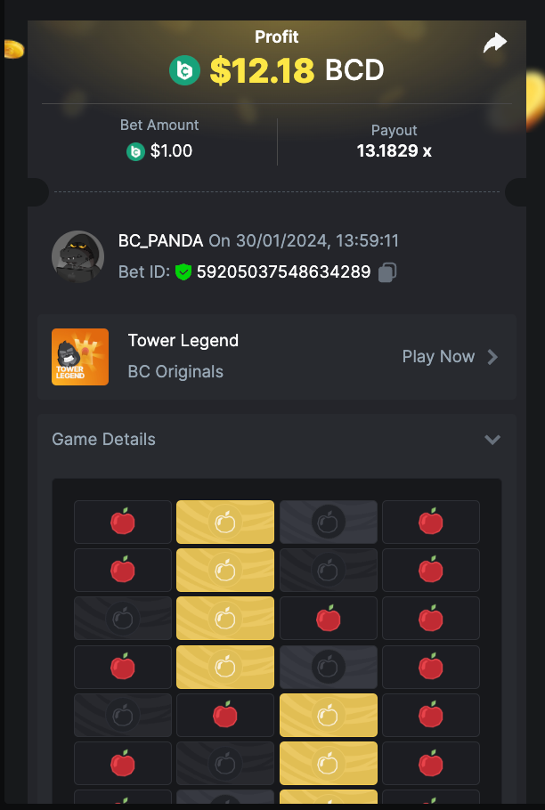 5. $5k Prestige Tower Legend Challenge #112 DURATION: 30th JAN - 6th FEB 14:30 UTC Attention VIPs! It's time to gear up and sprint to the pinnacle of each tower to claim your piece of this week's exhilarating prize pool! Join the rush from January 30 to February 6, ending at 14:30 UTC, and vie for a slice of the $5,000 prize bounty. Don't miss out; familiarize yourself with all the rules to fully engage in this electrifying challenge. Get ready to show your skills, and may luck be in your favor! Let's go, champions! WHAT IS THE CHALLENGE? Get to the top of the tower on any difficulty level at In-House Tower Legend. The player who gets to the top on the most levels will be the winner. If there's a tie, the player with the higher average bet amount (in USD) shall be the winner. If there is a tie in the amount and payout, the one who posted or edited his post first will be considered in the ranking. HOW TO ENTER To enter, copy the link of the bet you'd like to submit. Once you've copied it, paste it as a reply to this thread like so: Link: https://bc.game/#/sd/11RL29Q587Z1GZ In the same post, upload a screenshot of your win by clicking the game ID WITH VIEW IN USD mode ENABLED (accessible at the bottom of dropdown menu for your wallet up top. This way, we can ensure that your bet indeed met the minimum requirement at the time of placing it: LINK: https://bc.game/#/sd/11RL29Q587Z1GZ MINIMUM LEVEL Minimum VIP 8 with phone verified will be eligible! MINIMUM REQUIREMENTS Get to the top of 1 tower on any difficulty level. MINIMUM BET AMOUNT Min bet Easy - $ 1 USD equivalent Min bet Medium - $ 0.50 USD equivalent Min bet Hard - $ 0.20 USD equivalent Min bet Extreme - $ 0.10 USD equivalent Min bet Nightmare - $ 0.05 USD equivalent ELIGIBLE COINS All cryptocurrencies are eligible (excepting JB) AVAILABLE PRIZES GENERAL TERMS Please combine all of your hits into a single post. Edit your existing post for additional hits; don't create a new post. Each eligible entry must have the Bet Slip URL; failure to include it will disqualify participation in the event. The Bet Slip image is not mandatory. Bets must be posted within 24 hours of placing the bet in order to keep things fair for everyone. Bets must be made during the specified time window stated above. This thread will lock automatically when the time period is over. One (1) entry per household. Anyone found attempting to win multiple prizes will be disqualified from this challenge as well as all future challenges. Failure to follow the instructions will result in your submission being null and void. By entering this challenge, you acknowledge that BC.Game has the final say on results and placement. Payouts will be distributed after the event is finished. Please note that it could take anywhere between 3 to 7 days after the completion of the event.