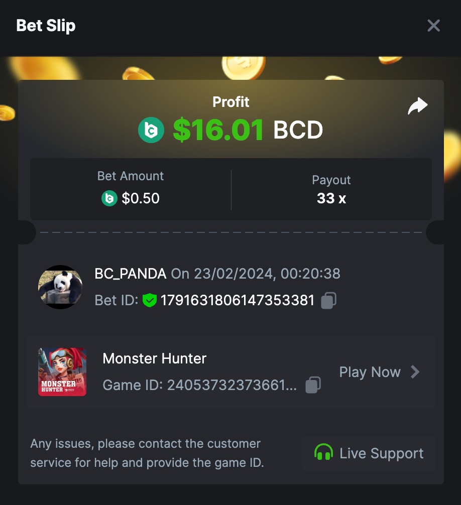 4. $5,000 BC Originals' New Slots Challenge DURATION: 23rd FEB - 1st MAR, 09:30 am UTC Attention VIPs! Get set for our latest excitement: Dive into the new slot game additions in BC Originals. Gear up for colossal multipliers and seize the opportunity to land hefty payouts with each spin. Join the action now and experience the exhilarating rush of big wins! What's the challenge? Capture a multiplier of 15x or higher on our BC Original slots mentioned below. Make sure you get your multiplier captured in my bets section. In the case of a tie in multipliers, ranking is based on higher average bet amounts (USD). If still tied, the first to post or edit their entry will be prioritized in the ranking. How to Enter To enter, copy the link to the bet you'd like to submit. Once you've copied it, paste it as a reply to this thread like so: Link: https://bc.game/#/sd/11T8H89NPFEOR3 In the same post, upload a screenshot of your win by clicking the game ID WITH VIEW IN USD mode ENABLED (accessible at the bottom of the drop-down menu for your wallet up top). This way, we can ensure that your bet indeed meets the minimum requirement at the time of placing it: Link: https://bc.game/#/sd/11T8H89NPFEOR3 Minimum VIP Minimum VIP 8 with phone verified will be eligible! Minimum Payouts The minimum payout to qualify is 15x Minimum Bet Size Run Away! Zombies: $0.1 Deadliest Sea: $0.1 John Wild: $0.1 Dragon Quest: $0.1 Wizard's Academy: $0.1 Doggy Miner: $0.5 Dragon Slayer: $0.5 Monster Hunter: $0.5 Eligible Coins All cryptocurrencies are eligible (excepting JB) Available Prizes GENERAL TERMS Please combine all of your hits into a single post. Edit your existing post for additional hits; don't create a new post. Each eligible entry must have the Bet Slip URL; failure to include it will disqualify participation in the event. The Bet Slip image is not mandatory. Bets must be posted within 24 hours of placing the bet in order to keep things fair for everyone. Bets must be made during the specified time window stated above. This thread will lock automatically when the time period is over. One (1) entry per household. Anyone found attempting to win multiple prizes will be disqualified from this challenge as well as all future challenges. Failure to follow the instructions will result in your submission being null and void. By entering this challenge, you acknowledge that BC.Game has the final say on results and placement. Payouts will be distributed after the event is finished. Please note that it could take anywhere between 3 to 7 days after the completion of the event.