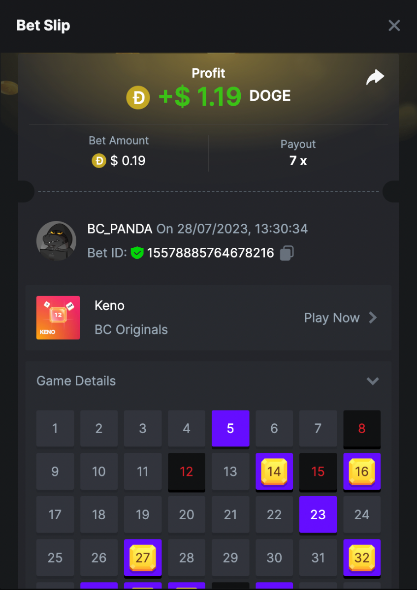 19. $5,000 Exclusive KENO Prestige Challenge #99 DURATION: 28th JULY - 4th AUGUST 12:30 pm UTC Hello VIPs! We're delighted to greet you all. This week, we have something truly special lined up for you - the Keno and Keno Multiplayer challenge with a fantastic prize pool of $5,000! The challenge will be held from 28th July to 4th August, starting at 12:30 UTC. Be sure to carefully read all the terms and conditions below to learn how you can participate in this exciting event. Best of luck to everyone! What's the Challenge? Complete as many of the following 22 payouts on either KENO or KENO Multiplayer. Must be a exact multiplier. | 5.10x | 7x | 8x | 11x | 17x | 26x | 30x | 56x | 63x | 81.5x | 100x | 180x | 250x | 270x | 350x | 450x | 500x | 600x | 710x | 800x | 900x | 1000x Each payout you hit above counts as 1 point (Maximum 1 point for each payout). If there is a tie, the player with the higher average bet amount (in USD) shall be the winner. How to Enter To enter, copy the link of the bet you'd like to submit. Once you've copied it, paste it as a reply to this thread like so: Link: https://bc.game/#/sd/11ES4BYXRW2I5J In the same post, upload a screenshot of your win by clicking the game ID WITH VIEW IN USD mode ENABLED (accessible at the bottom of dropdown menu for your wallet up top. This way, we can ensure that your bet indeed met the minimum requirement at the time of placing it: Link: https://bc.game/#/sd/11ES4BYXRW2I5J Minimum Level Minimum VIP 4 with phone verified will be eligible! Minimum Payouts Hit at least 3 payouts to qualify Minimum Bet Size $0.20 USD equivalent Eligible Coins All cryptocurrencies are eligible (excepting JB, and BCL) Available Prizes GENERAL TERMS Minimum VIP 4 with phone verified will be eligible! Minimum bet is $0.20 Please combine all of your hits together in a SINGLE post. Edit your existing post for additional hits, don't create a new post. Bets must be posted within 24 hours of placing bet in order to keep things fair for everyone. Bets must be made during the specified time window stated above. This thread will lock automatically when the time period is over. One (1) entry per household. Anyone found attempting to win multiple prizes will be disqualified from this challenge as well as all future challenges. Failure to follow instructions will result in your submission being null and void. By entering this challenge, you acknowledge that BC.Game has the final decision on results and placement. Payouts will be distributed after the event is finished. Please note that it could take up to 7 days after the completion of the event.