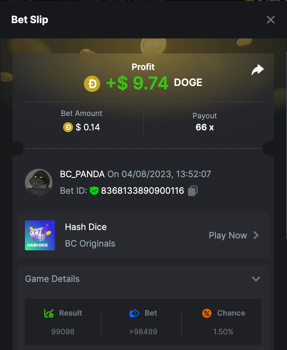 18. $5k Prestige Hash Dice Challenge #100 DURATION: 4th AUG - 11th AUG 12:30 pm UTC Greetings, esteemed VIPs! We are thrilled to extend our warmest welcome to each one of you. This week, we have an eagerly anticipated treat in store - the Hash Dice event, featuring an incredible prize pool of $5,000! The challenge is scheduled from 4th August to 11th August, commencing at 12:30 UTC. Kindly review the terms and conditions below attentively to grasp how you can partake in this exhilarating occasion. Wishing the best of luck to all participants! What's the Challenge? Complete as many of the following 20 payouts on Hash Dice. Must be a exact multiplier. | 22 | 33 | 44 | 55 | 66 | 77 | 88 | 99 | 111 | 222 | 333 | 444 | 555 | 666 | 777 | 888 | 999 | 1111 | 2222 | 3333 | Each payout you hit above counts as 1 point (Maximum 1 point for each payout). If there is a tie, the player with the higher average bet amount (in USD) shall be the winner. How to Enter To enter, copy the link of the bet you'd like to submit. Once you've copied it, paste it as a reply to this thread like so: Link: https://bc.game/#/sd/11F9I4D1YXDFFR In the same post, upload a screenshot of your win by clicking the game ID WITH VIEW IN USD mode ENABLED (accessible at the bottom of dropdown menu for your wallet up top. This way, we can ensure that your bet indeed met the minimum requirement at the time of placing it: Link: https://bc.game/#/sd/11F9I4D1YXDFFR Minimum VIP Minimum VIP 4 with phone verified will be eligible! Eligibility to Win Prize Win at least 3 payouts to qualify. Minimum Bet Size $0.15 equivalent Eligible Coins All cryptocurrencies are eligible (excepting JB) Available Prizes GENERAL TERMS Please combine all of your hits together in a SINGLE post. Edit your existing post for additional hits, don't create a new post. Each eligible entry must have the Bet Slip URL, failure to include it will disqualify participation in the event. Bet Slip image is not mandatory. Bets must be posted within 24 hours of placing bet in order to keep things fair for everyone. Bets must be made during the specified time window stated above. This thread will lock automatically when the time period is over. One (1) entry per household. Anyone found attempting to win multiple prizes will be disqualified from this challenge as well as all future challenges. Failure to follow instructions will result in your submission being null and void. By entering this challenge, you acknowledge that BC.Game has the final decision on results and placement. Payouts will be distributed after the event is finished. Please note that it could take anywhere between 24 hours to 7 days after the completion of the event.