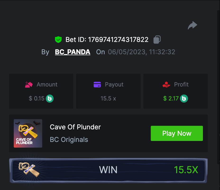 24. $5k Prestige CAVE Challenge #87 DURATION: 6th MAY - 12th MAY 09:00 am UTC This weeks Prestige Challenge is back with a long awaited game CAVE OF PLUNDER! Take part in this amazing yet challenging event to split prizes worth $5,000! Duration of this challenge will be from 6th MAY - 12th MAY 09:00 UTC. Don't forget to read all terms below to find out how to participate in this event. Good Luck! What's the Challenge? Capture a multiplier - 7.5x or higher on the Cave of Plunder Game. Make sure you get your multiplier captured on my bets section. The highest multiplier will be considered. If a tie occurs in the multiplier, the next ranking player with the higher average bet amount (in USD) being the 2nd winner and so on. If there is a tie in the amount and multiplier, the one who posted or edited his post first will be considered in the Ranking. How to Enter To enter, copy the link of the bet you'd like to submit. Once you've copied it, paste it as a reply to this thread like so: Link: https://bc.game/#/sd/11928W19XHY903 In the same post, upload a screenshot of your win by clicking the game ID WITH VIEW IN USD mode ENABLED (accessible at the bottom of dropdown menu for your wallet up top. This way, we can ensure that your bet indeed met the minimum requirement at the time of placing it: Link: https://bc.game/#/sd/11928W19XHY903 Minimum VIP Minimum VIP 4 with phone verified will be eligible! Minimum Payouts Minimum payout to qualify is 7.5x Minimum Bet Size $0.15 USD equivalent Eligible Coins All cryptocurrencies are eligible (excepting JB) Available Prizes GENERAL TERMS Please combine all of your hits together in a SINGLE post. Edit your existing post for additional hits, don't create a new post. Each eligible entry must have the Bet Slip URL, failure to include it will disqualify participation in the event. Bet Slip image is not mandatory. Bets must be posted within 24 hours of placing bet in order to keep things fair for everyone. Bets must be made during the specified time window stated above. This thread will lock automatically when the time period is over. One (1) entry per household. Anyone found attempting to win multiple prizes will be disqualified from this challenge as well as all future challenges. Failure to follow instructions will result in your submission being null and void. By entering this challenge, you acknowledge that BC.Game has the final decision on results and placement. Payouts will be distributed after the event is finished. Please note that it could take anywhere between 24 hours to 7 days after the completion of the event.