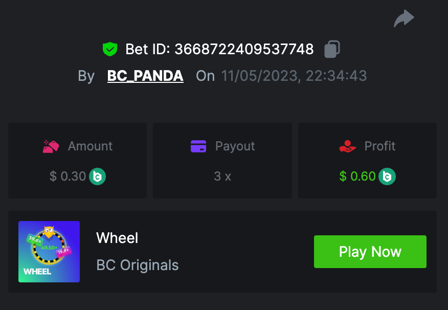22. $5k Prestige Wheel Challenge #88 DURATION: 12th MAY - 19th MAY 09:00 am UTC Hello dear VIPs! This week we are hosting the Prestige challenge with our Favourite Wheel game! Take part in this amazing yet challenging event to split prizes worth $5,000! Duration of this challenge will be from 12th MAY - 19th MAY 09:00 UTC. Don't forget to read all terms below to find out how to participate in this event. Good Luck! What's the Challenge? Participants must win as many consecutive bets as possible by hitting the colour Orange or Purple (On in-house Wheel game). Consecutive bets must be of the same colour to validate the entry. Any selected Risk and Segment are valid which has these colours. Rank will be determined by the largest amount of consecutive bets, the longest sequence will be in 1st place and successively. In the event of a tie, the advantage will be given to the highest average bet in dollars. In the event of a tie again, the first bet placed will have the advantage. How to Enter To enter, copy the link of the bet you'd like to submit. Once you've copied it, paste it as a reply to this thread like so: Link: https://bc.game/#/sd/119FRYCHYZ6SYB In the same post, upload a screenshot of your win by clicking the game ID WITH VIEW IN USD mode ENABLED (accessible at the bottom of dropdown menu for your wallet up top. This way, we can ensure that your bet indeed met the minimum requirement at the time of placing it: Link: https://bc.game/#/sd/119FRYCHYZ6SYB Minimum VIP Tier Minimum VIP 4 with phone verified will be eligible! Minimum Bets Win at least 3 consecutive bets to qualify, hitting one of the 2 colours mentioned above (Consecutive wins must be the same colour). Minimum Bet Size $0.30 USD equivalent Eligible Coins All cryptocurrencies are eligible (excepting JB) Available Prizes GENERAL TERMS Please combine all of your hits together in a SINGLE post. Edit your existing post for additional hits, don't create a new post. Bets must be posted within 24 hours of placing bet in order to keep things fair for everyone. Bets must be made during the specified time window stated above. This thread will lock automatically when the time period is over. One (1) entry per household. Anyone found attempting to win multiple prizes will be disqualified from this challenge as well as all future challenges. Failure to follow instructions will result in your submission being null and void. By entering this challenge, you acknowledge that BC.Game has the final decision on results and placement. Payouts will be distributed after the event is finished. Please note that it could take anywhere between 24 hours to 7 days after the completion of the event.