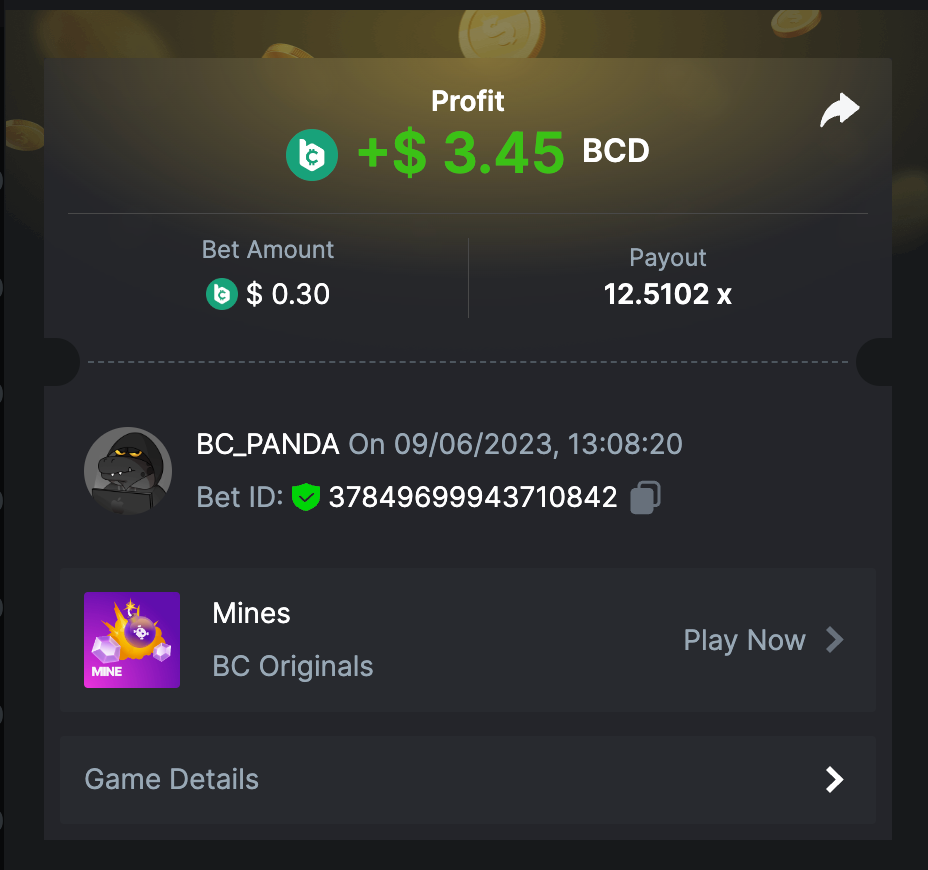 10. $5k Prestige Mines Challenge #92 DURATION: 9th JUNE - 16th JUNE 10:00 am UTC Welcome back, VIP's, this week, you are going to face the Prestige Challenge with your Mines. his week, we have a thrilling Mines tournament focused on highest multipliers. The rules are straightforward, and the prize pool is absolutely fantastic. Without further ado, let's jump right into the event. Take a look at the terms and conditions provided below: What's the Challenge? Win the highest multiplier you can on on BC.Game's in-house game, Mines. If there is a tie, the player with the higher average bet amount (in USD) shall be the winner. If there is a tie in the amount and payout, the one who posted or edited his post first will be considered in the Ranking How to Enter To enter, copy the link of the bet you'd like to submit. Once you've copied it, paste it as a reply to this thread like so: Link: https://bc.game/#/sd/11BENSXEXH2GWJ In the same post, upload a screenshot of your win by clicking the game ID WITH VIEW IN USD mode ENABLED (accessible at the bottom of dropdown menu for your wallet up top. This way, we can ensure that your bet indeed met the minimum requirement at the time of placing it: Link: https://bc.game/#/sd/11BENSXEXH2GWJ Minimum VIP Minimum VIP 4 with phone verified will be eligible! Minimum Payouts Minimum payout to qualify is 10x Minimum Bet Size $0.30 USD equivalent Eligible Coins All cryptocurrencies are eligible (excepting JB) Available Prizes GENERAL TERMS Please combine all of your hits together in a SINGLE post. Edit your existing post for additional hits, don't create a new post. Each eligible entry must have the Bet Slip URL, failure to include it will disqualify participation in the event. Bet Slip image is not mandatory. Bets must be posted within 24 hours of placing bet in order to keep things fair for everyone. Bets must be made during the specified time window stated above. This thread will lock automatically when the time period is over. One (1) entry per household. Anyone found attempting to win multiple prizes will be disqualified from this challenge as well as all future challenges. Failure to follow instructions will result in your submission being null and void. By entering this challenge, you acknowledge that BC.Game has the final decision on results and placement. Payouts will be distributed after the event is finished. Please note that it could take anywhere from 48 hours to 7 days after the completion of the event.