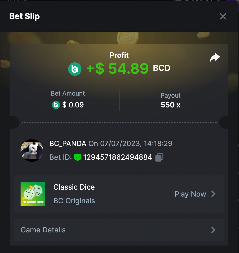 2. $5k Prestige Classic Dice Challenge #96 DURATION: 7th JULY - 14th JULY 12:30 pm UTC Welcome VIPs! Get ready to seize the moment and embrace the thrill! Brace yourselves for the electrifying Classic Dice challenge! Your mission? Conquer 25 precise target payouts and unite as a formidable force, amassing a colossal 1 point (with a maximum of 16 points)! But that's not all – the prize pool of $5,000 awaits those who dare to take part in this extraordinary and audacious event! Prepare yourselves, for life is a daring adventure, filled with untold possibilities. It's time to cast away doubt and hesitation, and let the dice guide your destiny! Let the games begin! What's the Challenge? Complete as many of the following 25 payouts on our in-house Classic Dice. Must be a winning bet. | 5x | 15x | 25x | 33x | 44x | 55x | 66x | 75x | 90x | 99x | 100x | 150x | 180x | 220x | 300x | 330x | 396x | 450x | 550x | 825x | 900x | 1100x | 2475x | 3300x | 4950x | Each payout you hit above counts as 1 point (Maximum 1 point for each payout). If there is a tie, the player with the higher average bet amount (in USD) shall be the winner. How to Enter To enter, copy the link of the bet you'd like to submit. Once you've copied it, paste it as a reply to this thread like so: Link: https://bc.game/#/sd/11DC5WGXAYR1G3 In the same post, upload a screenshot of your win by clicking the game ID WITH VIEW IN USD mode ENABLED (accessible at the bottom of dropdown menu for your wallet up top. This way, we can ensure that your bet indeed met the minimum requirement at the time of placing it: Link: https://bc.game/#/sd/11DC5WGXAYR1G3 Minimum VIP Minimum VIP 4 with phone verified will be eligible! Eligibility to Win Prize Win at least 4 payouts to qualify. Minimum Bet Size $0.10 USD equivalent Eligible Coins All cryptocurrencies are eligible (excepting JB) Available Prizes GENERAL TERMS Please combine all of your hits together in a SINGLE post. Edit your existing post for additional hits, don't create a new post. Each eligible entry must have the Bet Slip URL, failure to include it will disqualify participation in the event. Bet Slip image is not mandatory. Bets must be posted within 24 hours of placing bet in order to keep things fair for everyone. Bets must be made during the specified time window stated above. This thread will lock automatically when the time period is over. One (1) entry per household. Anyone found attempting to win multiple prizes will be disqualified from this challenge as well as all future challenges. Failure to follow instructions will result in your submission being null and void. By entering this challenge, you acknowledge that BC.Game has the final decision on results and placement. Payouts will be distributed after the event is finished. Please note that it could take anywhere between 24 hours to 7 days after the completion of the event.