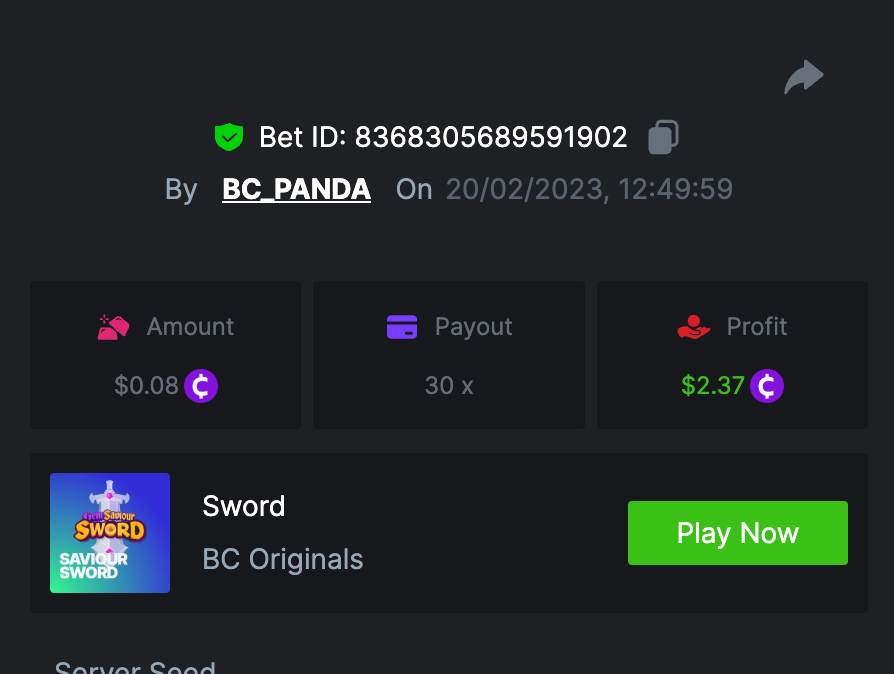 $1.5k Prestige Saviour Sword Challenge #71 DURATION: 20th FEB - 23rd FEB 09:00 am UTC Welcome back, VIP's, this week, you are going to face the Prestige Challenge with your Saviour Swords. Total prize pool of $1,500 will be distributed between 20 top challengers plus $250 worth of bounties included for anyone getting 100x multiplier. Read more details below and lets bring out those swords: What's the Challenge? Get the highest multiplier you can on BC.Game's in-house slot, Saviour Sword. In case of a tie, the participant with a higher bet amount will be given the advantage. If there is a tie in the amount and payout, the one who posted or edited his post first will be considered in the Ranking. How to Enter To enter, copy the link of the bet you'd like to submit. Once you've copied it, paste it as a reply to this thread like so: Link: https://bc.game/#/sd/113WDQAF0ZM5UB In the same post, upload a screenshot of your win by clicking the game ID WITH VIEW IN USD mode ENABLED (accessible at the bottom of dropdown menu for your wallet up top. This way, we can ensure that your bet indeed met the minimum requirement at the time of placing it: Link: https://bc.game/#/sd/113WDQAF0ZM5UB Minimum VIP There's no minimum VIP level Minimum Payout Minimum payout to qualify is 10x Minimum Bet Size $0.08 USD equivalent Eligible Coins All coins are eligible (excepting JB, and BCL) Available Prizes Positions 1st 2nd 3rd 4th 5th 6th-10th 11th-20th Bounty Prizes $500 $250 $125 $75 $50 $125 $125 $250 EXTRA BOUNTY Go an extra mile and get a share of this Bounty! To be a part of Bounty, win 100x or higher with $0.12 or above bet! Original rules apply with all minimum requirements. GENERAL TERMS Please combine all of your hits together in a SINGLE post. Edit your existing post for additional hits, don't create a new post. Bets must be posted within 24 hours of placing bet in order to keep things fair for everyone. Bets must be made during the specified time window stated above. This thread will lock automatically when the time period is over. One (1) entry per household. Anyone found attempting to win multiple prizes will be disqualified from this challenge as well as all future challenges. Furthermore, you will go on the WALL OF SHAME for all to see that you are a scam. Scam 4 Scam. Failure to follow instructions will result in your submission being null and void. By entering this challenge, you acknowledge that BC.Game has the final decision on results and placement. Payouts will be distributed after the event is finished. Please note that it could take up to 4 days after the completion of the event.