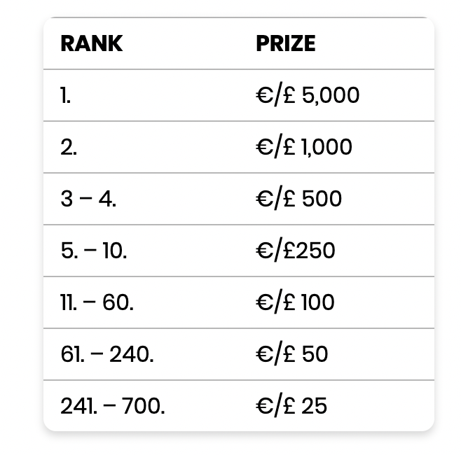 DURATION: 1st MAR - 26th APR PRIZE POOL: $100,000 Spinomenal's new Grand Tour tournament is now available at BC.GAME with amazing $100,000 worth cash prize pool! Below you will find out the details of rounds and reward distribution methods below! Don't miss out on this amazing opportunity to make some extra cash while you are enjoying the games! Terms and conditions will remain same for the whole tournament: How to Participate Each win rewards the Player with a score based on the win multiplier (for example, if you waged $1 and won $10, you will be rewarded with 10 points). The more points you collect, the higher your position will be on the leaderboard. You can see the leaderboard in the participating games to check the scores and more details about the tournament. Don't forget to check below General terms section for all the rules. Participating Games Round Details Round Round name Dates Prize Pool Number of Winners 1 Lucky Lady 1st MAR - 8th MAR €10,000 70 2 Beer Race 9th MAR - 15th MAR €10,000 70 3 Patrick’s Lucky Week 16th MAR - 22nd MAR €10,000 70 4 Blooming Luck 23rd MAR - 29th MAR €10,000 70 5 Egg Hunt 30th MAR - 5th APR €10,000 70 6 Fields of Wins 6th APR - 12th APR €10,000 70 7 Gold Seeker 13th APR - 19th APR €15,000 90 8 The Final Showdown 20th APR - 26th APR €25,000 90 Prize Pool Distribution ROUNDS 1-6 ($10,000 each round) From Place To Place Prize Sum 1 1 $1,600 $1,600 2 2 $1,400 $1,400 3 3 $1,200 $1,200 4 4 $1,000 $1,000 5 5 $800 $800 6 6 $500 $500 7 7 $400 $400 8 8 $300 $300 9 9 $200 $200 10 10 $100 $100 11 20 $70 $700 21 30 $55 $550 31 40 $40 $400 41 60 $30 $600 61 70 $25 $250 ROUNDS 7 ($15,000) From Place To Place Prize Sum 1 1 $2,000 $2,000 2 2 $1,800 $1,800 3 3 $1,600 $1,600 4 4 $1,400 $1,400 5 5 $1,200 $1,200 6 6 $900 $900 7 7 $800 $800 8 8 $600 $600 9 9 $400 $400 10 10 $200 $200 11 20 $110 $1,100 21 30 $80 $800 31 40 $60 $600 41 60 $40 $800 61 70 $30 $300 71 90 $25 $500 ROUNDS 8 ($25,000) From Place To Place Prize Sum 1 1 $2,500 $2,500 2 2 $2,300 $2,300 3 3 $2,000 $2,000 4 4 $1,800 $1,800 5 5 $1,600 $1,600 6 6 $1,200 $1,200 7 7 $1,100 $1,100 8 8 $1,000 $1,000 9 9 $800 $800 10 10 $600 $600 11 20 $300 $3,000 21 30 $200 $2,000 31 40 $120 $1,200 41 60 $90 $1,800 61 80 $80 $1,600 81 90 $50 $500 GENERAL TERMS 10% of the score each Player gains during each Tournament round will be collected as credit points and added to the Player’s score in the final round (Round 8). Each Player’s rank in the Leaderboard for each round will appear once they reach the qualifying score, as displayed on the Players’ toolbar. The Tournament is available during real-money play only. Minimum qualifying bet per spin to participate in the Tournament is 0.2 EUR (“Minimum Qualifying Bet”). If the Minimum Qualifying Bet is not available on one of the Participating Games, the closest higher bet amount shall constitute as the Minimum Qualifying Bet for that game. No additional deposits or costs by Players are required to participate in the Tournament. Participation in the Tournament is automatic once a Player waged at least a Minimum Qualifying Bet in one of the Participating Games. By qualifying for the Tournament and playing the games, each Player agrees to these terms and conditions and to all other terms and conditions set by the Operator hosting this Tournament. Each Player participating in the Tournament will receive a unique Tournament ID for the Leaderboard, per each currency that Player plays with. Changing the currency during the duration of the Tournament may reset the Player’s progress on the Leaderboard. If two or more Players have the same number of points at the end of each round, the Player who reached the points first will be ranked higher. Prizes for Players playing the Games with Cryptocurrencies will be displayed in EUR. Participating Operators will disburse prizes in accordance with their payment terms. Only finished spins will qualify for the Leaderboard. During the Tournament, Players may be offered to play the Participating Games as part of various promotional efforts made available from time to time in accordance with the terms of such efforts. By participating in such efforts, Players may be rewarded with additional points. All amounts are displayed in-game in the currency each Player wages with. Any exchange rates shall be calculated based on Spinomenal’s internal exchange rate. The rules, terms, and conditions of the tournament are subject to all applicable laws and can be changed at any time upon prior written notice to Players participating in the Tournament. Players’ continued participation in the Tournament following such notice shall constitute its acceptance of such changes. The Operator together with its partners reserves the right to stop the Tournament at any time for an indefinite period without paying the prizes. In case of discrepancy of interpretation of the English version of these Terms and any other versions or iterations of these Terms because of difference in translation, this English version shall prevail. Spinomenal reserves the right to stop the Tournament at any time for an indefinite period without paying the prizes, where it reasonably believes that continuing the Tournament will cause harm to Spinomenal, Players or, an Operator. The rules, terms, and conditions of the Tournament can be changed at any time, in accordance with Spinomenal’s sole discretion.