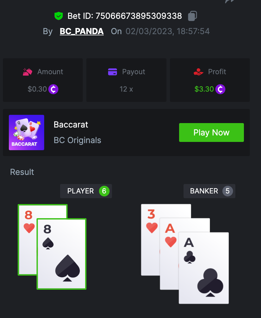 $1.5k Prestige Baccarat Challenge #74 DURATION: 2nd MAR - 6th MAR 14:00 pm UTC Hey, hey, BC Players! It's time to get ready to play some Baccarat! This weekend lets compete each other and be a part of this $1,500 Prize Pool. Top 20 players will share the rewards and also $250 are up for the bounty hunters which can be won by single player or be shared by more players who achieve the bounty. Keep reading below to find out more details: What's the Challenge? Win a bet by selecting the Player Pair or Bank Pair on BC.Game's in-house game, Baccarat Single Player (No spread bets). Rank will be determined by the highest average bet amount (USD), the player with the highest bet amount will be ranked 1st, and so on. If there is a tie in the amount and payout, the one who posted or edited his post first will be considered. How to Enter To enter, copy the link of the bet you'd like to submit. Once you've copied it, paste it as a reply to this thread like so: Link: https://bc.game/#/sd/114LSJQXJ5DPG3 In the same post, upload a screenshot of your win by clicking the game ID WITH VIEW IN USD mode ENABLED (accessible at the bottom of dropdown menu for your wallet up top. This way, we can ensure that your bet indeed met the minimum requirement at the time of placing it: Link: https://bc.game/#/sd/114LSJQXJ5DPG3 Minimum VIP There's no minimum VIP level Minimum Payouts Minimum payout to qualify is 12x Minimum Bet Size $0.30 USD equivalent Eligible Coins All cryptocurrencies are eligible (excepting JB) Available Prizes Positions 1st 2nd 3rd 4th 5th 6th-10th 11th-20th Bounty Prizes $500 $250 $125 $75 $50 $125 $125 $250 EXTRA BOUNTY Share a winning tie bet (all cards must be red), both player's & banker's cards, and receive an equal share of the $250 prize pool! Original rules apply with all minimum requirements, no spread bets, etc. GENERAL TERMS Please combine all of your hits together in a SINGLE post. Edit your existing post for additional hits, don't create a new post. Each eligible entry must have the Bet Slip URL, failure to include it will disqualify participation in the event. Bet Slip image is not mandatory. Bets must be posted within 24 hours of placing bet in order to keep things fair for everyone. Bets must be made during the specified time window stated above. This thread will lock automatically when the time period is over. One (1) entry per household. Anyone found attempting to win multiple prizes will be disqualified from this challenge as well as all future challenges. Failure to follow instructions will result in your submission being null and void. By entering this challenge, you acknowledge that BC.Game has the final decision on results and placement. Payouts will be distributed after the event is finished. Please note that it could take up to 4 days after the completion of the event.