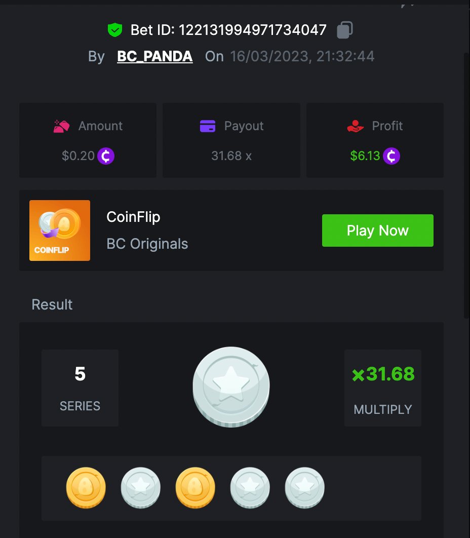 $1.5k Prestige Coinflip Challenge #78 DURATION: 16th MAR - 20th MAR 16:00 pm UTC Hello to all the VIPs, it's time to Flip! The challenge we bring for you this week is Coin Flip and participants will need to keep up with the flipping journey as much as possible to take home the great rewards. The Prize pool is $1,500 of which $250 will be reserved for the extra bonus. Get ready! Life is a gamble and you never know what comes next, so roll the dice! What's the Challenge? Win the highest multiplier you can on in-house Coinflip (Most flips in a row). If there is a tie, the player with the higher average bet amount (in USD) shall be the winner. If there is a tie in the amount and payout, the one who posted or edited his post first will be considered in the Ranking. How to Enter To enter, copy the link of the bet you'd like to submit. Once you've copied it, paste it as a reply to this thread like so: Link: https://bc.game/#/sd/115KR0BX7GTPG3 In the same post, upload a screenshot of your win by clicking the game ID WITH VIEW IN USD mode ENABLED (accessible at the bottom of dropdown menu for your wallet up top. This way, we can ensure that your bet indeed met the minimum requirement at the time of placing it: Link: https://bc.game/#/sd/115KR0BX7GTPG3 Minimum VIP There's no minimum VIP level Minimum Payouts Minimum payout to qualify is 31.68x (5 Flips) Minimum Bet Size $0.2 USD equivalent Eligible Coins All cryptocurrencies are eligible (excepting JB) Available Prizes Positions 1st 2nd 3rd 4th 5th 6th-10th 11th-20th Bounty Prizes $500 $250 $125 $75 $50 $125 $125 $250 EXTRA BOUNTY Share a bet completing 10 Flips or more (Even losing a bet also counts), and receiving an equal share of the $250 prize pool! Original rules apply with all minimum requirements. E.g: Let's say someone completed 10 flips but lost on the 11th flip, the bet still counts as a reward. GENERAL TERMS Please combine all of your hits together in a SINGLE post. Edit your existing post for additional hits, don't create a new post. Each eligible entry must have the Bet Slip URL, failure to include it will disqualify participation in the event. Bet Slip image is not mandatory. Bets must be posted within 24 hours of placing bet in order to keep things fair for everyone. Bets must be made during the specified time window stated above. This thread will lock automatically when the time period is over. One (1) entry per household. Anyone found attempting to win multiple prizes will be disqualified from this challenge as well as all future challenges. Failure to follow instructions will result in your submission being null and void. By entering this challenge, you acknowledge that BC.Game has the final decision on results and placement. Payouts will be distributed after the event is finished. Please note that it could take anywhere between 24 hours to 7 days after the completion of the event.