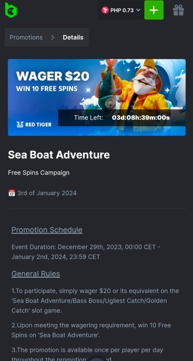 2. Hello dear what happen to Red Tiger - Sea Boat Adventure promotion? I cannot claim my free spins because game won't load Everytime and stuck at 57% bar. Spent more than 20$ wager til lose all coins in bass boss. Please check the game first...
