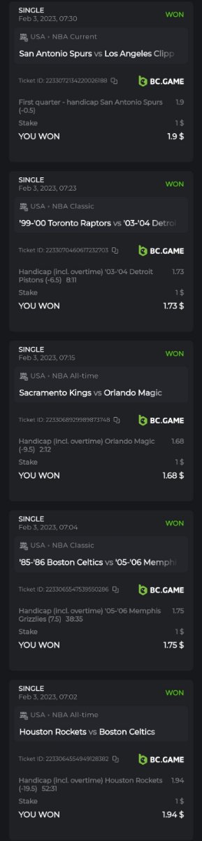 For checking: Game: NBA2k No. of bets weekly: 5 Min. Bet per game: $1 Min. odds: 1.5 Transaction ids: 2233072134220026188 (san Antonio spurs vs la clippers) 2233070460617232703 (toronto raptors vs Detroit pistons) 2233068929989873748 (Sacramento king vs. Orlando magic) 2233065547539550286 (boston celtics vs memphis grizzlies) 2233064554949128382 (houston rockets vs. boston celtics) I have questions: 1. I don't do hedge betting as you can see I bet on 5 different games but in your rules you have not mentioned you prohibit hedging. Is it allowed? 2. What minimum level is eligible? 3. Do you add decimals (e.g. 1.56$+1.54$=3.1$ means 1.1$ points) in odds that sum up to one point? I guess not. 4. Have you credited won/loss points to qualified bets? As you can see I should have 5 points or 5 points more (if decimals are added)for 5 entries but I only got 4.