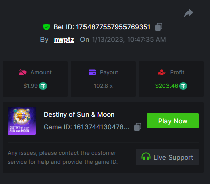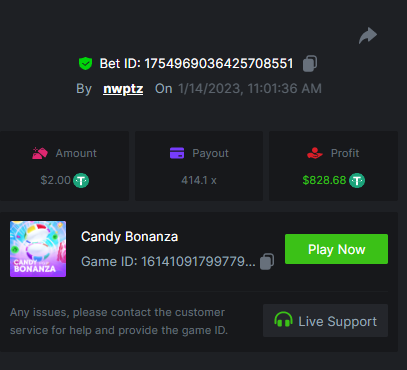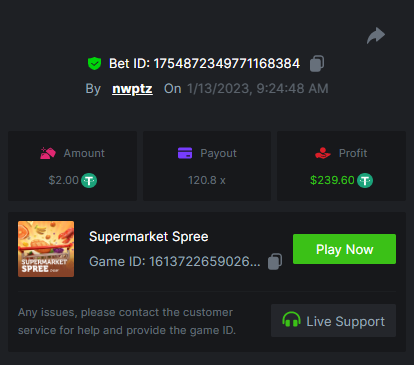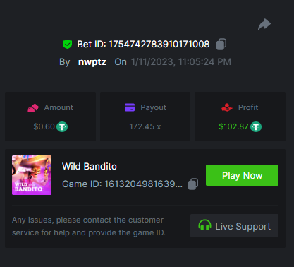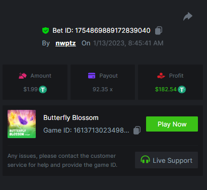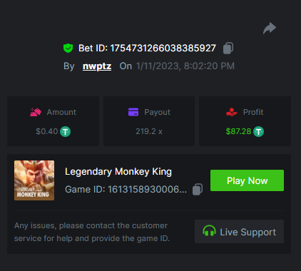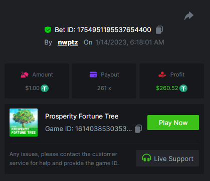 1. 1. Prosperity Fortune Tree Bet ID: https://bc.game/#/sd/111BVADCIO2BKJ Screenshot: 2. Butterfly Blossom Bet ID: https://bc.game/#/sd/1119N7L5NRG36B Screenshot: 3. Legendary Monkey King Bet ID: https://bc.game/#/sd/1115UPO0WYUDQR Screenshot: 4, Spirited Wonders Bet ID: https://bc.game/#/sd/1119O9DKLIR5EB Screenshot: 5. Supermarket Spree Bet ID: https://bc.game/#/sd/1119PMTXCPKV0Z Screenshot: 6. Candy Bonanza Bet ID: https://bc.game/#/sd/111CCUMEY4EDCJ Screenshot: 7. Destiny of Sun & Moon Bet ID: https://bc.game/#/sd/1119US1SLHM1OZ Screenshot: 8. Leprechaun Riches Bet ID: https://bc.game/#/sd/111C1ZDGLO4843 Screenshot: 9. Wild Bandito Bet ID: https://bc.game/#/sd/111662VB4AX7GZ Screenshot: 10. Wild Bounty Showdown Bet ID: https://bc.game/#/sd/1119STIAQVERKJ Screenshot: