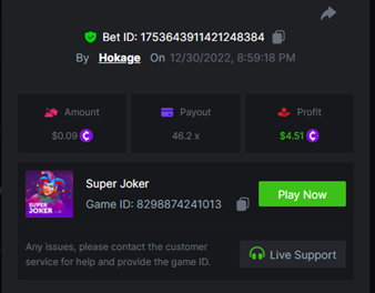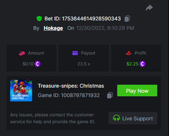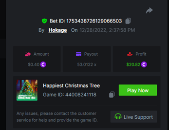 Christmas Gift Rush - 41.00x https://bc.game/#/sd/1106HUV436QZ2R Happiest Christmas Tree - 53.01x https://bc.game/#/sd/1106I1YS5JH1QR Hot Hot Fruit - 39.67x https://bc.game/#/sd/1106IEVPIWRJF7 Lucky Fortune Cat - 14.64x https://bc.game/#/sd/1106ILJBX9MI37 Naughty Santa - 17.40x https://bc.game/#/sd/1106IW4WL0CS9F