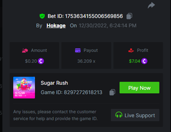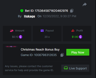 Treasure Snipres Christmas - 23.50x https://bc.game/#/sd/110C4S9TC9OHZN Christmas Reach Bonus Buys - 20.00x https://bc.game/#/sd/110C605YO03ZMB Ice Mania - 20.00x https://bc.game/#/sd/110C669DL8ABYR Collapsed Castle - 36.00x https://bc.game/#/sd/110C6M9RVXMHHV Fruit Super Nova - 250.00x https://bc.game/#/sd/110C7CHZQSBOYB -
