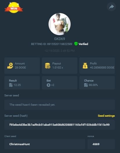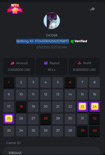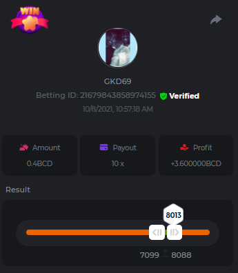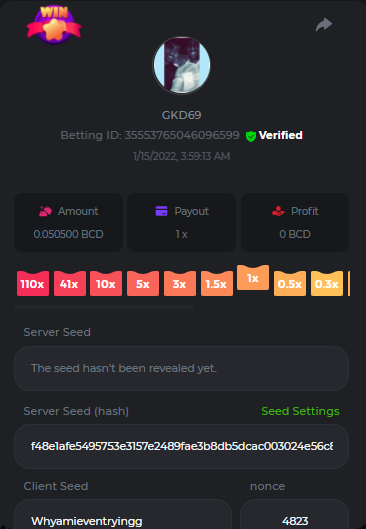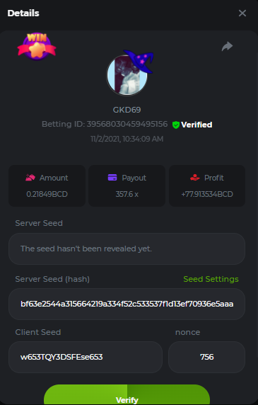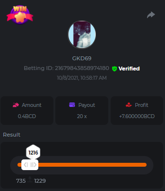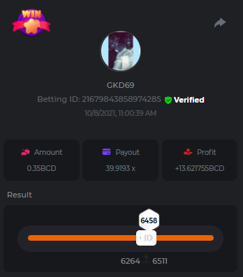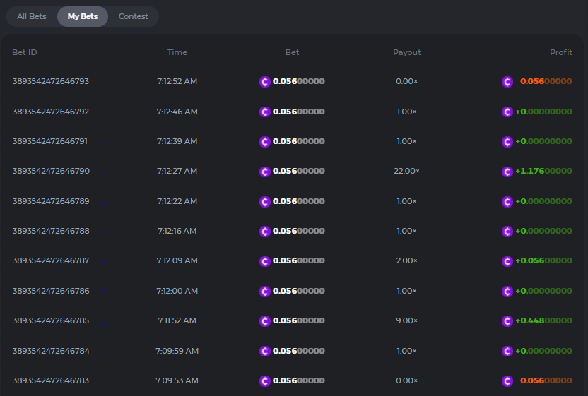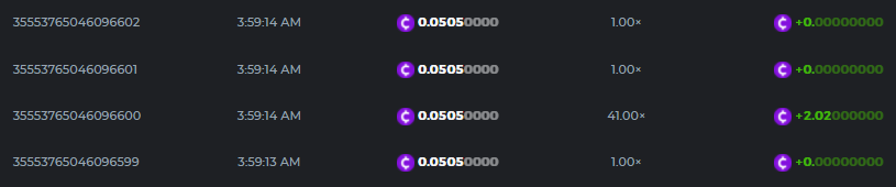 6. Bet ID: #21679843858974155 (10x) Bet ID: #21679843858974180 (20x) Bet ID: #21679843858974264 (30x) Bet ID: #21679843858974285 (40x - Not sure why it always shows me only 39.9193x O.o) Bet ID: #21679843858974292 (50x)