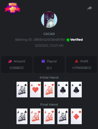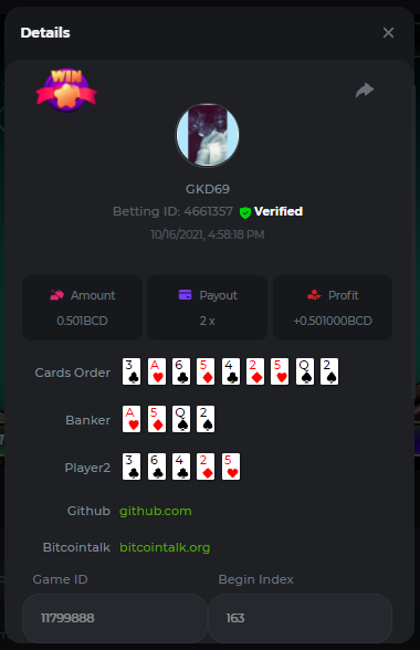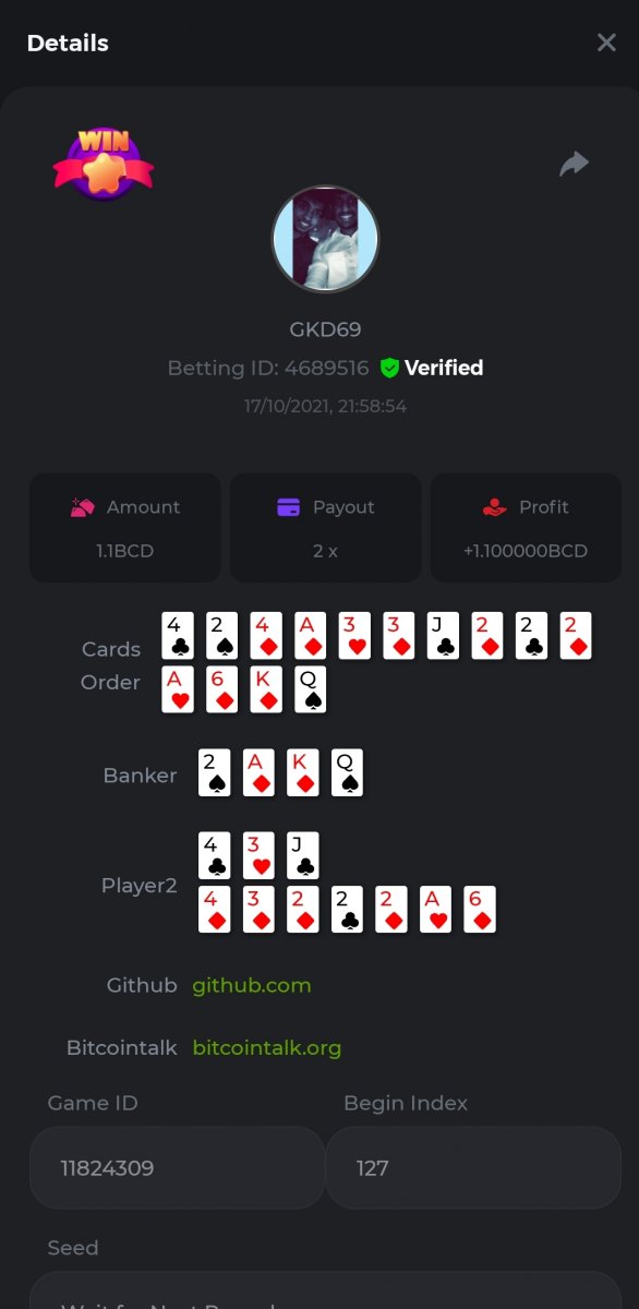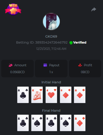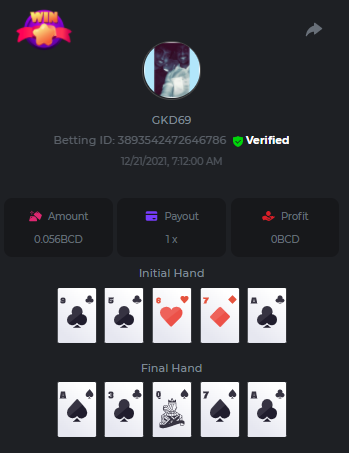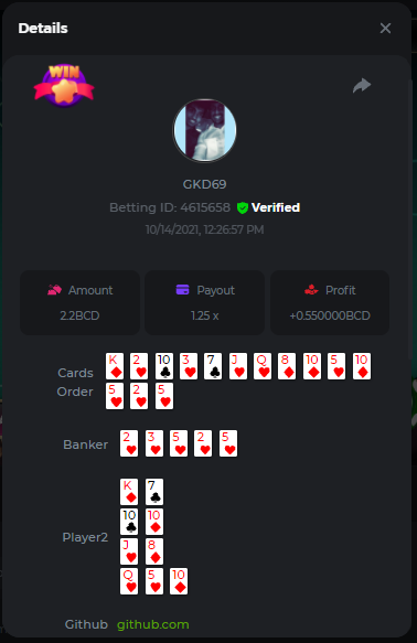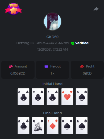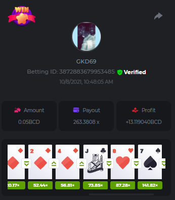 5. Betting ID: 4689516 (14 cards) https://bcgame-project.github.io/bcgame-blackjack/?s=YYOvj4oS%2FeLYG4tUhexnTsvIoj3ZEmAdggATvQi9Z3YEncIAbhfpyw1Q5kfB3njzOp55Ni9I53TONExCvl8Wh8sPK5PjDKpUcmtf2JWeGgrek38pxp1XVxuyB7PIq6%2FEMZh6qgLVUNZYTS3eZPcOUC0U2rc1YLWPBsSgP57nZMQ%3D&i=222768&range=127,141 ____________________________________________________________________________________________________ Betting ID: 4615658 (14 cards) https://bcgame-project.github.io/bcgame-blackjack/?s=lICcvpFFS9u%2BNgYd5yue6RN3tDUpgPdRnwerVoLeM06H8yTxmw5vvpXVpdzF7RjT%2Fh5MXTEwrdzl7CyC6rZ3y0Spf3mJ%2FlsPQqoRd2MT1NAct4FGI9H31aOGI0Lx85Wi70N4TYe1pS0Jrhyf5O8a%2B6uoNl67dsEY8z%2FTCYq9%2Bjw%3D&i=221653&range=237,251 Adding another entry cus im not sure if its eligible, however the bet is 1.25x and so it is a win technically. @digitaldash any further information about various payouts would be great, cus in BJ with insurance, splits etc the payouts could vary. ____________________________________________________________________________________________________ MASTER BONUS COMPLETED Betting ID: 4661357 (Player - 2,3,4,5,6) https://bcgame-project.github.io/bcgame-blackjack/?s=R6TLzK7mddp59iehua2Mu8Ey26Pv7MvpHXJUciGx1okbhSFQ3ZGYvJz0f%2FSQX0jxEQAWELPpD1Dgb2o7dYaEYikuSudEDMkptn0kboQoXyBQh2872kY7Z5QurjcR0tb6UKn8zfSwqeMQWZtysIwhrx1z955mrBYZDKZ3XfjCBZU%3D&i=222338&range=163,172