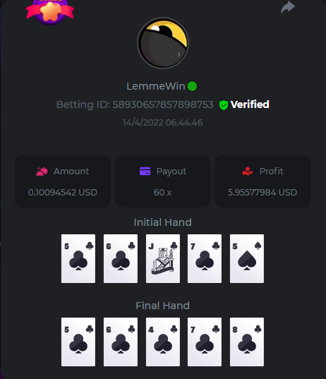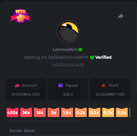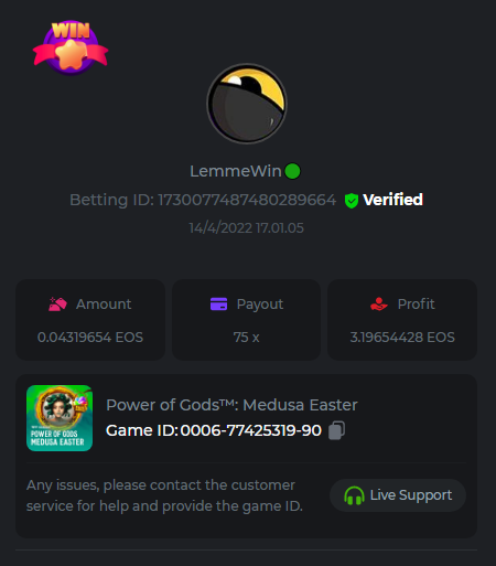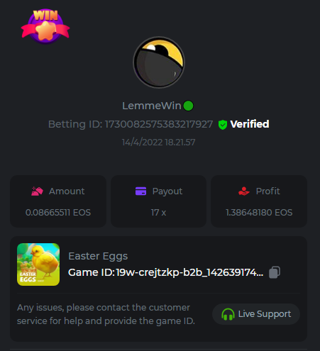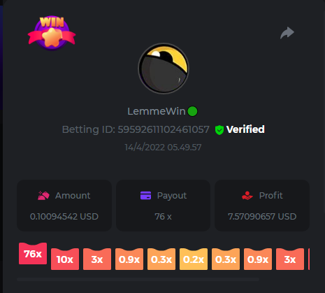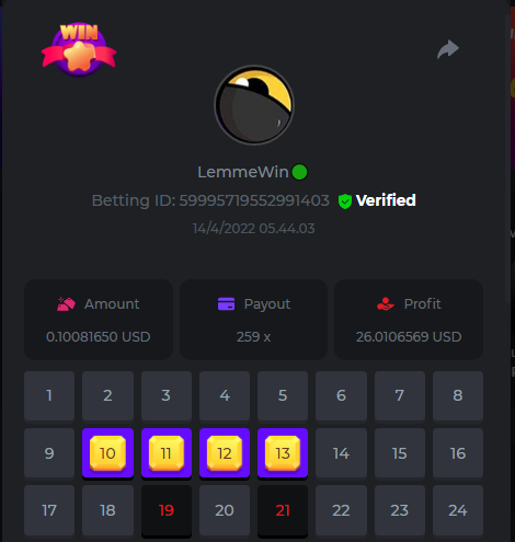 Easy 1. IG profile: https://www.instagram.com/amalive_/ 2. IG profile: https://www.instagram.com/amalive_/ Post link: https://www.instagram.com/p/CcTQ3wCvibE/ 3. Twitter profile: @amalive89 4. Twitter profile: @amalive89 Post link: 5. FB profile: https://web.facebook.com/amalive89/ 6. Cave 7.5x - https://bc.game/sd/?sd=10IDCOEKP2BI1F 7. sports at least 1.3x - 2126003035011425107 8. Lady fruits - https://bc.game/sd/?sd=10IG6J0M1OO5QR 9. Ramses books Easter eggs- https://bc.game/sd/?sd=10IFP1BIBKT0YB 10. 2FA - Yes, have done it a long long time ago lol Medium 1. Easter eggs - https://bc.game/sd/?sd=10IFOLHYPHDGK3 2. Roulette 36x - https://bc.game/sd/?sd=10IDFIUHFBQAKZ 3. Plinko 76x - https://bc.game/sd/?sd=10IEE0DB15K9HV 4. Power of God's - https://bc.game/sd/?sd=10IFJMP03WG7PV 5. Sport single min 2x - 2126162973348212951 6. Hit straight flush 60x - https://bc.game/sd/?sd=10IEHEUAHQIQ6R 7. Keno 50x - https://bc.game/sd/?sd=10IDRBGEPN9TZN 8. White Rabbit min 90x - https://bc.game/sd/?sd=10IGQ9U0T8TY4Z 9. Red BJ - https://bc.game/sd/?sd=10IE0IN6CO3H8Z 10. Bonus Bunnies min 100x - https://bc.game/sd/?sd=10IGTRDTRUKBV7 (IDK the bet record can't be loaded properly, though my net is fine) Hard 1. Wheel 49.5x - https://bc.game/sd/?sd=10IDD5X2G34L5F 2. Plinko 420x - https://bc.game/sd/?sd=10IE5982L5U5UB 3. 4. 5. 6. Chicken Drop 100x - https://bc.game/sd/?sd=10IELODMQ7EP77 7. 8. 9. Keno 259x - https://bc.game/sd/?sd=10IEDSLJQSOEFN 10.