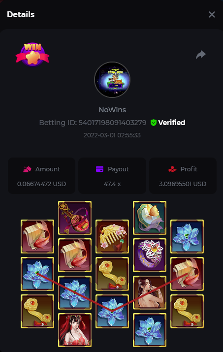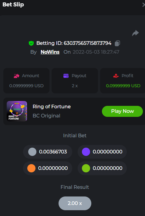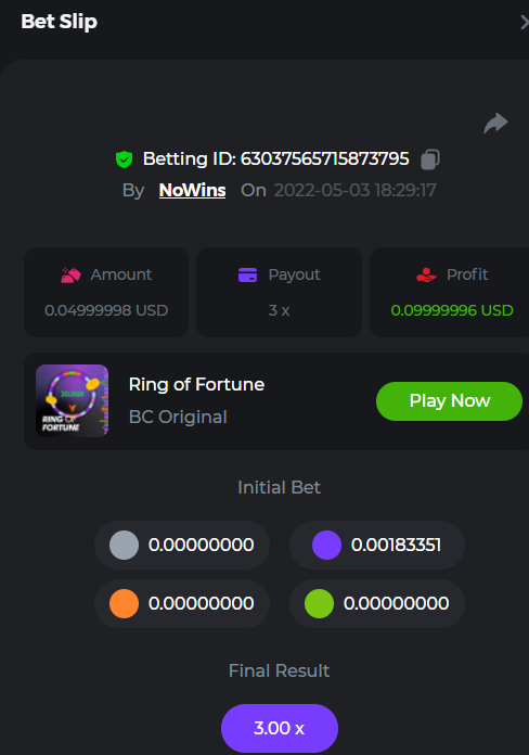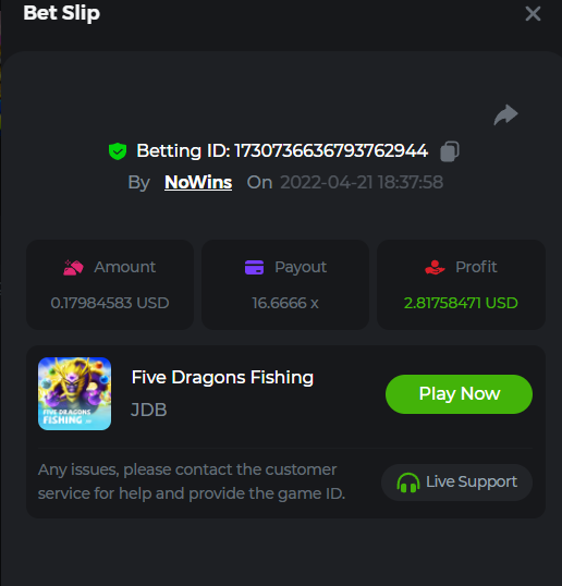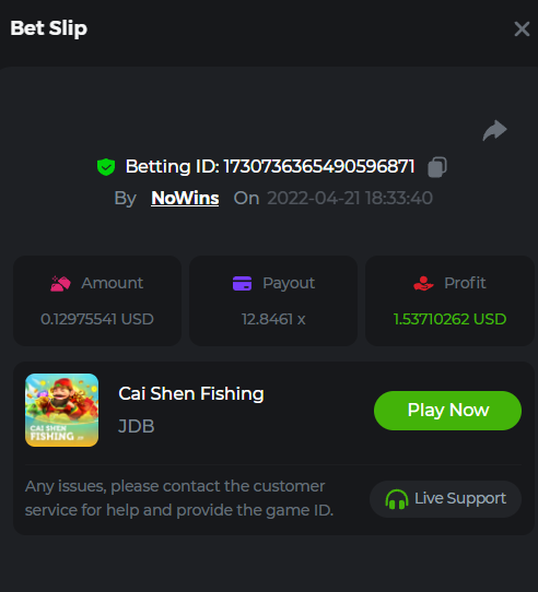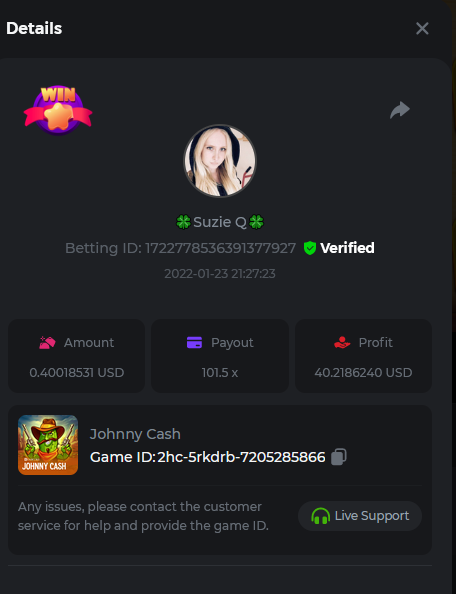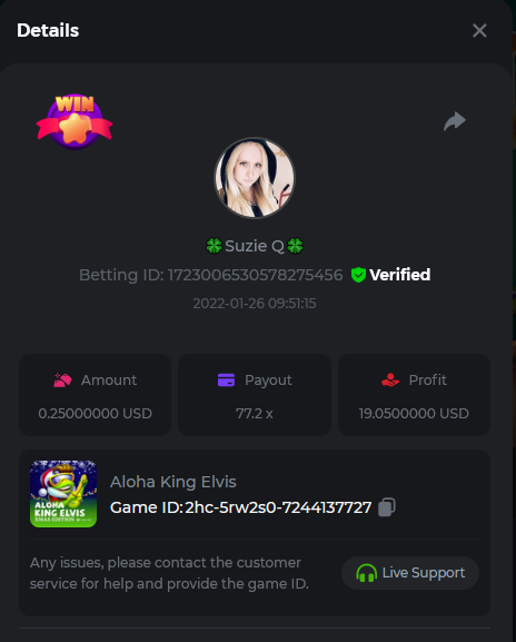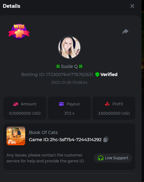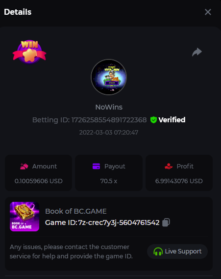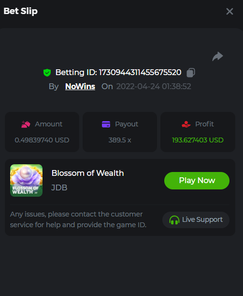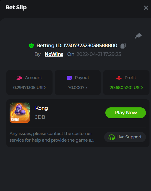 Johnny Cash Bet ID: 1722778536391377927 Bonanza Billions Bet ID: 1722920824272650503 Aloha King Elvis Bet ID: 1723006530578275456 Book of cats Bet ID: 1723007641776762631 Fruit Million Bet ID: 1722925370467220999
