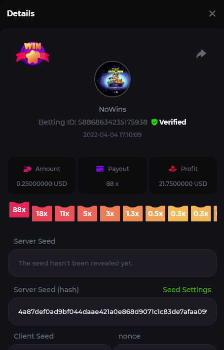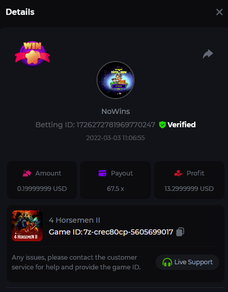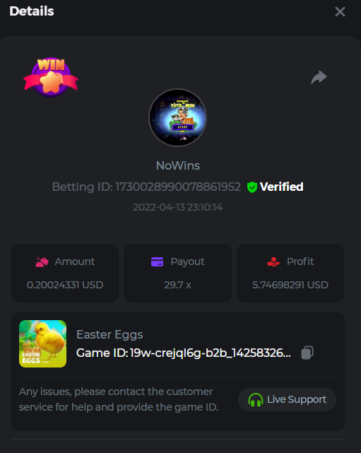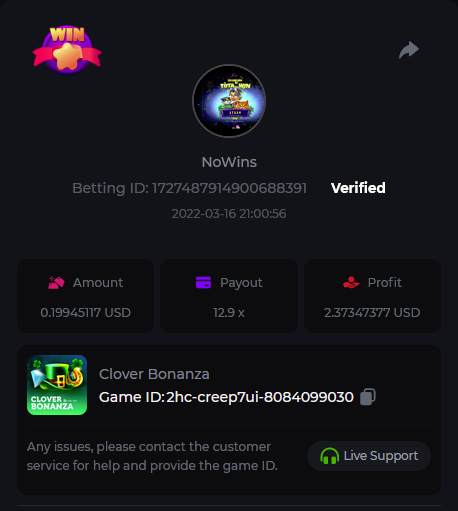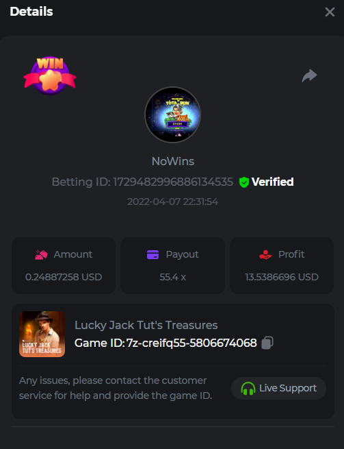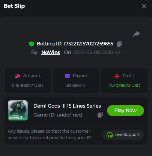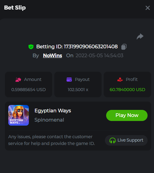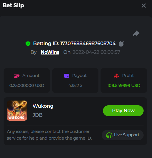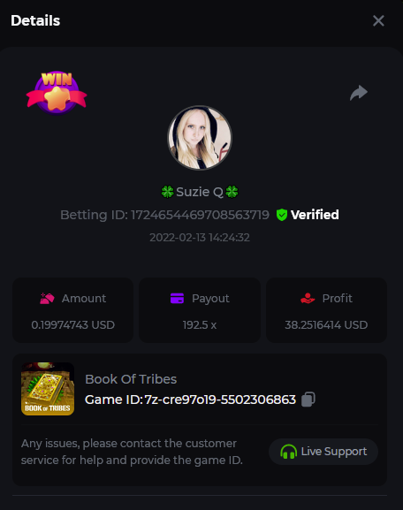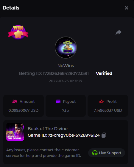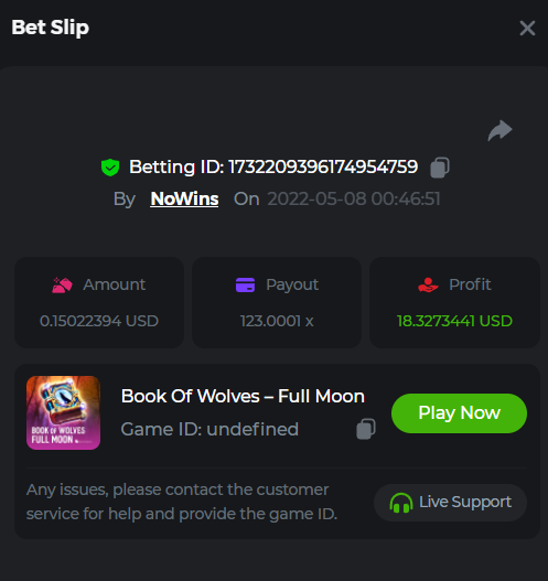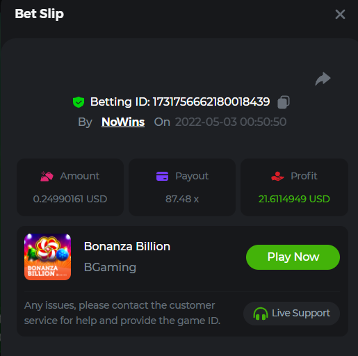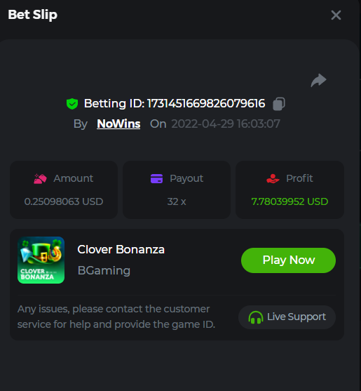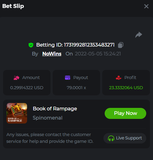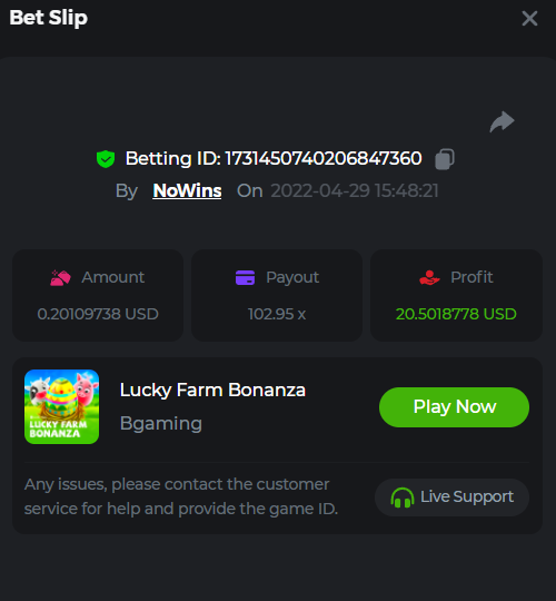 Book of Tribes - Bet ID: 1724412718370129671 Wild Fruits - Bet ID: 1724415618767348864 (I hate games w/o free spins / Bonus game) Book of the Divine. Reloaded - Bet ID: 1724417315092041735 This is the closest I got to the bounty: 129.5 x -