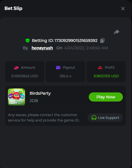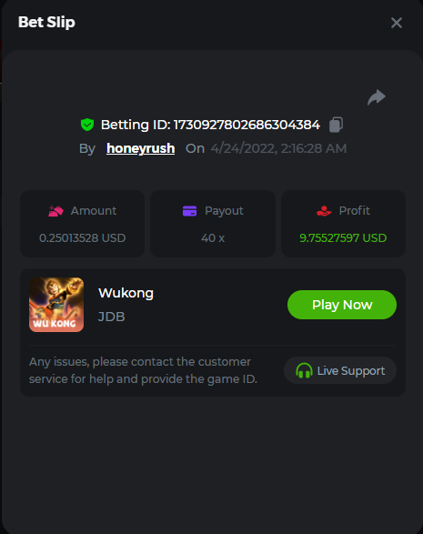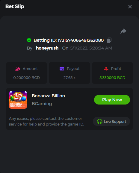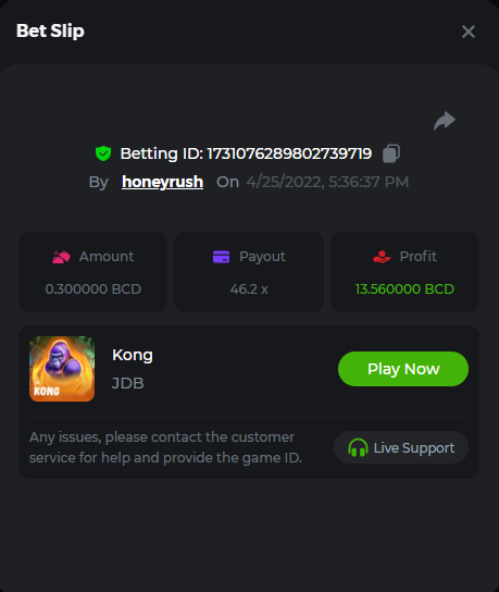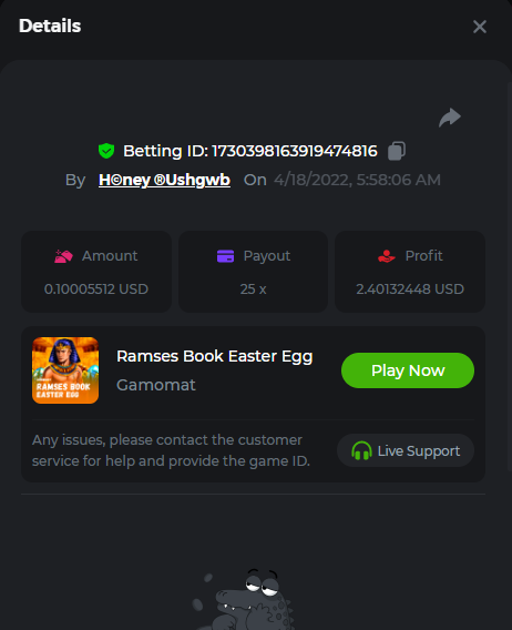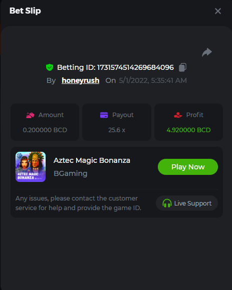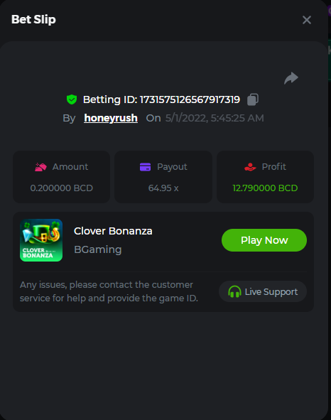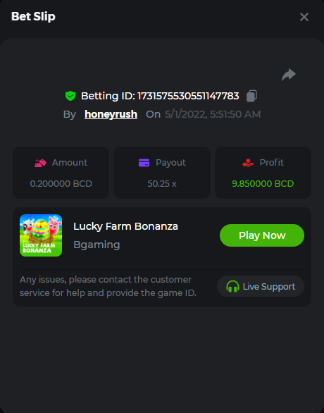 EASY 5. Follow facebook 6. Win a bet in Cave of Plunder on 7.50x payout (Completing all book symbols). https://bc.game/sd/?sd=10IOAUY1DMITXV 7. Win a Sports bet with minimum odds being 1.3x (singles only) 1$ base min amount Ticket ID: 2127589574879359646 9. Get a minimum 30x multi on Gamomat Ramses Book Easter Egg slot MEDIUM 1. Get a minimum 10x multi on Play&Go Easter Eggs slot . https://bc.game/sd/?sd=10IOMF6657ILUB 2. Win a bet in Roulette Single with betting on 0 only (36x). https://bc.game/sd/?sd=10IOLHZX616EXF 5. Win a Sports bet with minimum odds of 2x (singles only) 1$ base min amount. 2127635932017463576 9. Win a bet by getting a natural Blackjack (A+K/Q/J/10) with only red cards in it. HARD 1. Get a 49.50x on Wheel (50 segments, High risk). https://bc.game/sd/?sd=10IOKTWYGHXVKJ