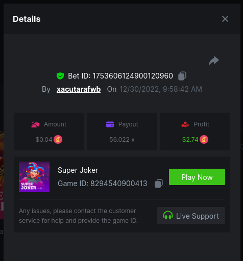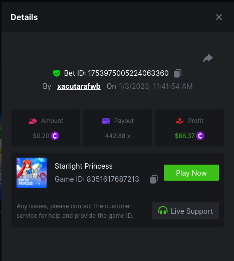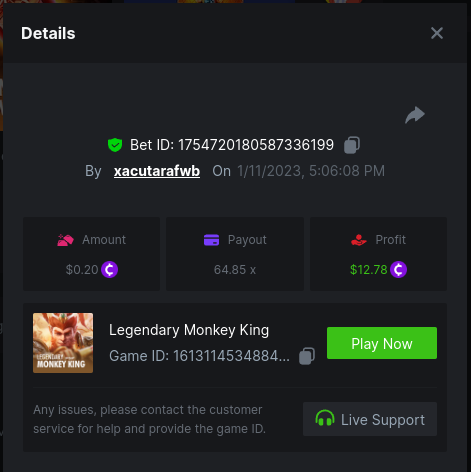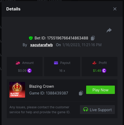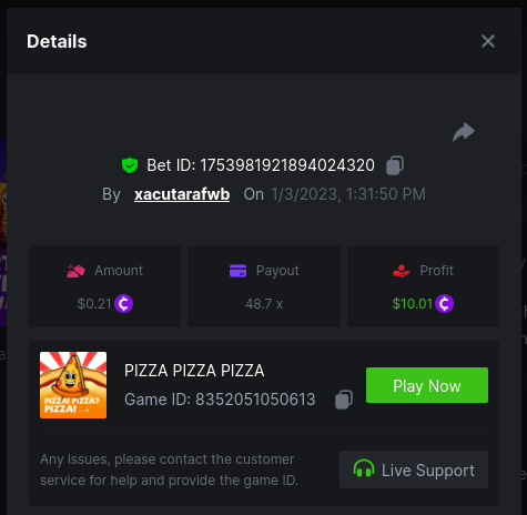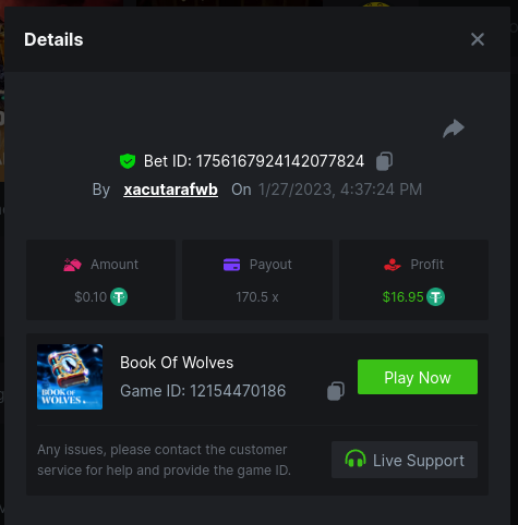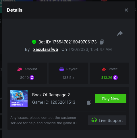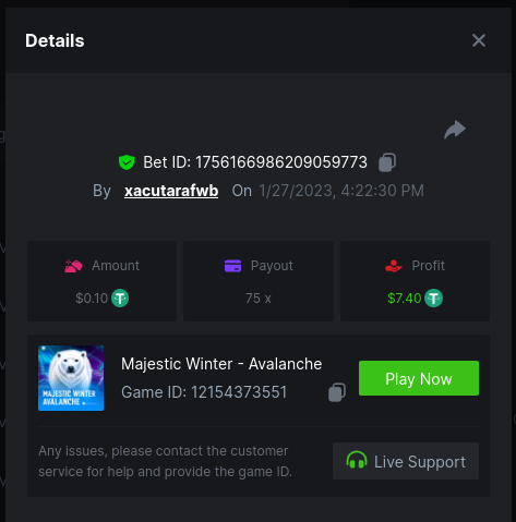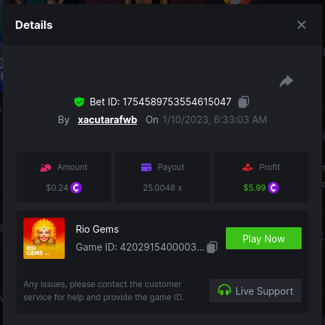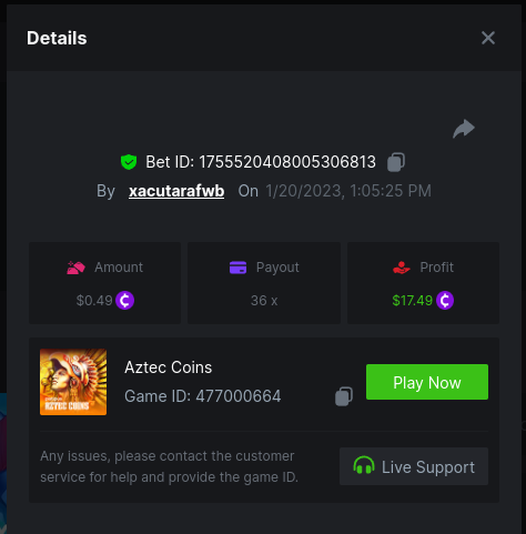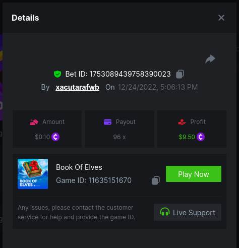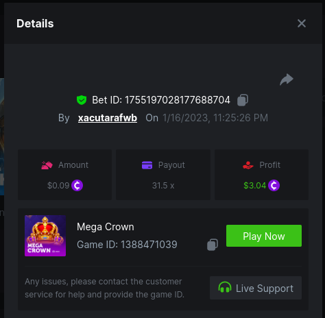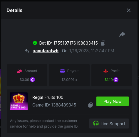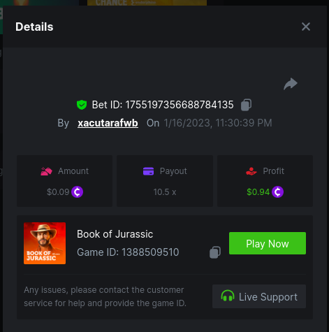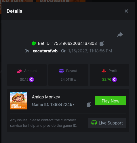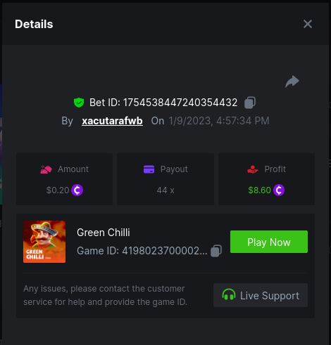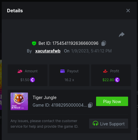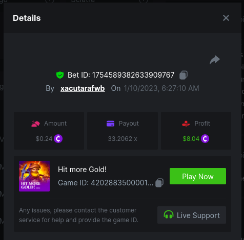 Amigo Monkey 24.01 x https://bc.game/#/sd/111IKWFPCYSAHF Blazing Crown 16 x https://bc.game/#/sd/111IL1J1U6IFWZ Mega Crown 31.5 x https://bc.game/#/sd/111ILARRQ6L4WJ Regal Fruits 100 12.1 x https://bc.game/#/sd/111ILG5KGRTQFN Book of Jurassic 10.5 x https://bc.game/#/sd/111ILMQ4EUIF4J -