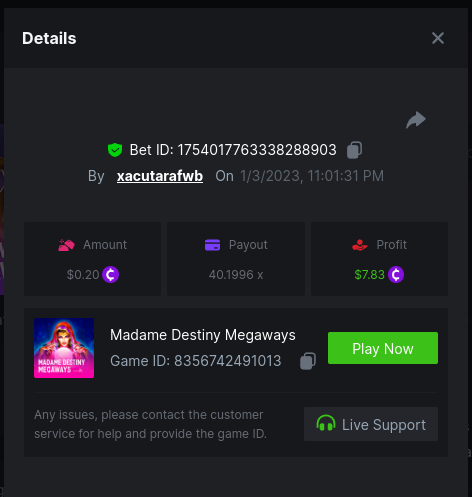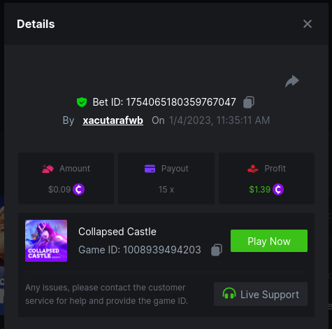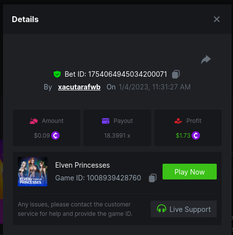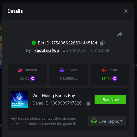 Elven Princesses 18.39 x https://bc.game/#/sd/110NMLPSYNBT3N Collapsed Castle 15 x https://bc.game/#/sd/110NMULSLQV9CJ Cycle Of Luck 11 x https://bc.game/#/sd/110NN0N7XX9RTF Wolf Hiding Bonus Buy 119 x https://bc.game/#/sd/110NNUR40VO45V