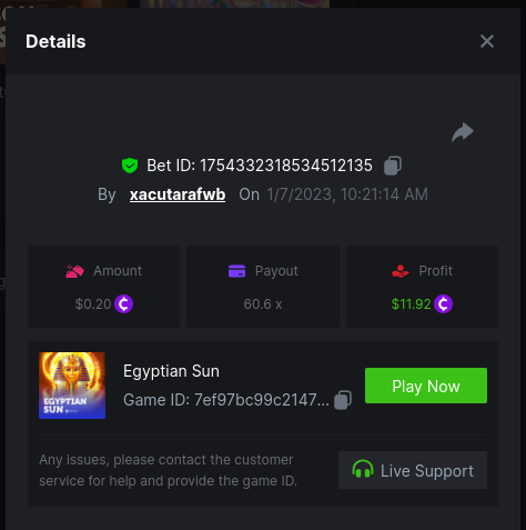 Shake Shake Leprechaun 27.3 x https://bc.game/#/sd/110UX687NVORV7 Egyptian Sun 60.6 x https://bc.game/#/sd/110UXXJCWOENF7 -