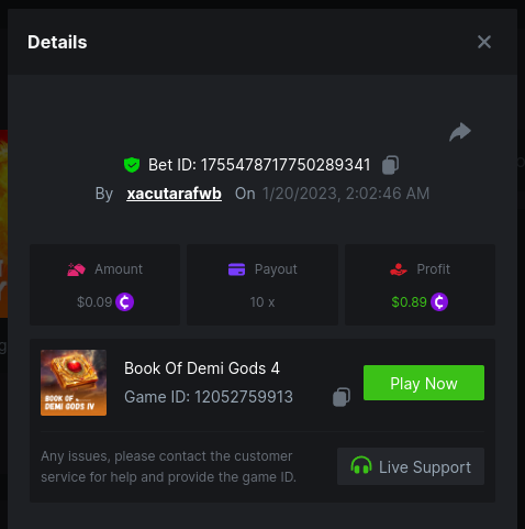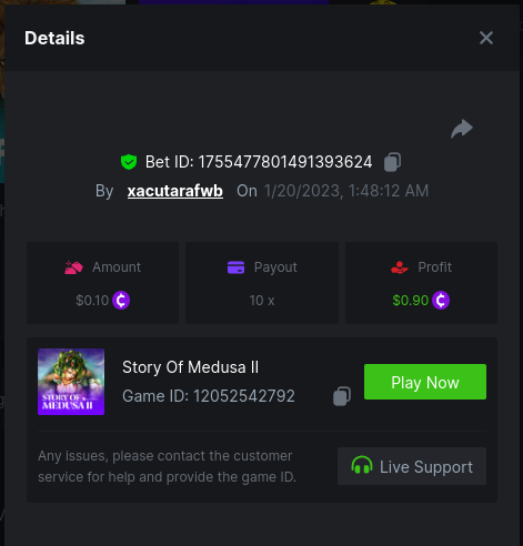 Story Of Medusa II 10 x https://bc.game/#/sd/111Q9R0F0ZJ3F7 Book Of Rampage 2 133.5 x https://bc.game/#/sd/111QA5IRIAR6DV Book Of Demi Gods 4 10 x https://bc.game/#/sd/111QANGUJO9VDF -
