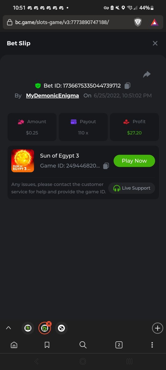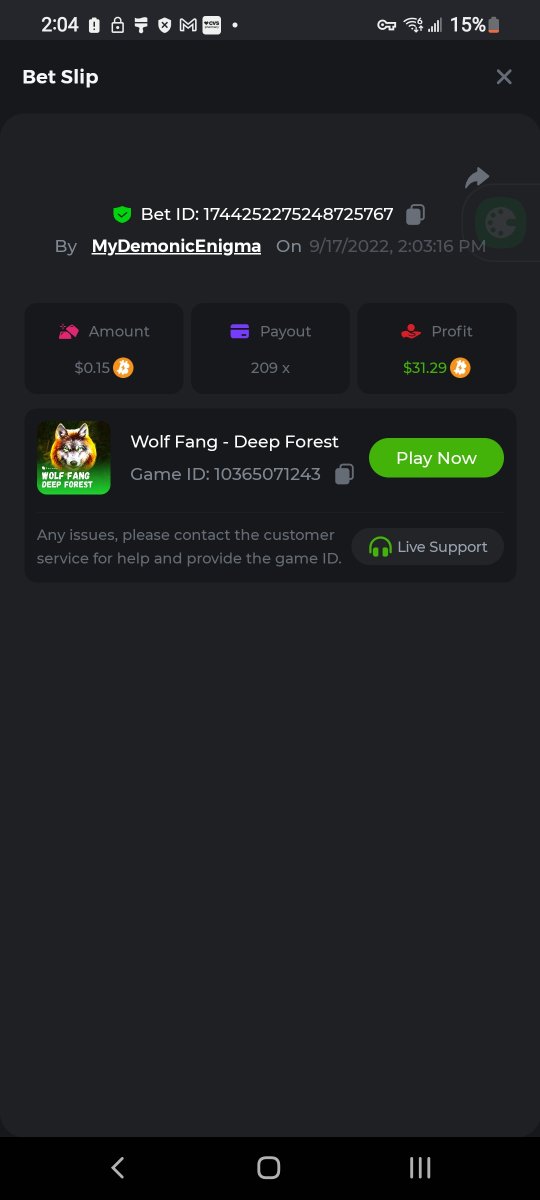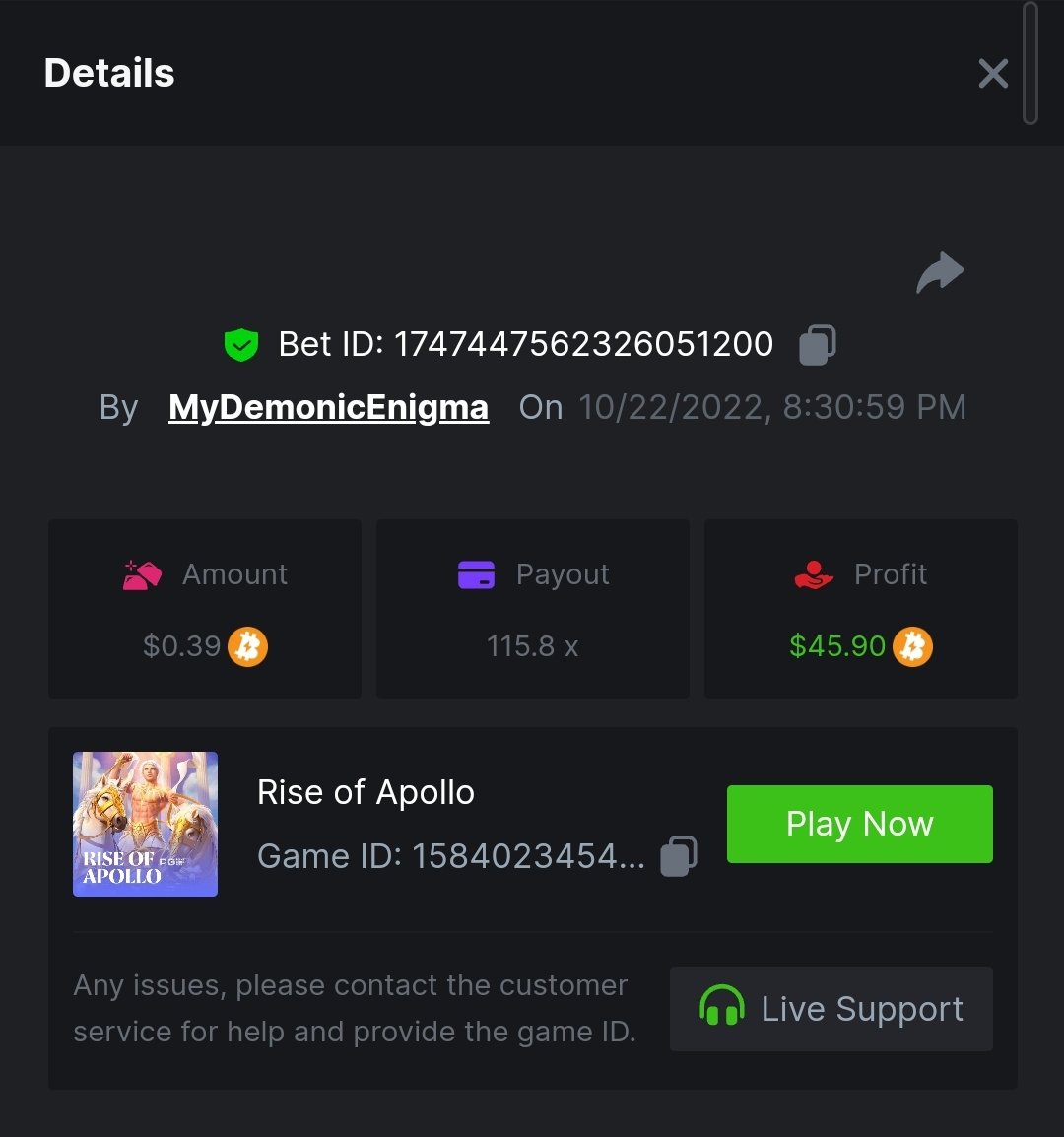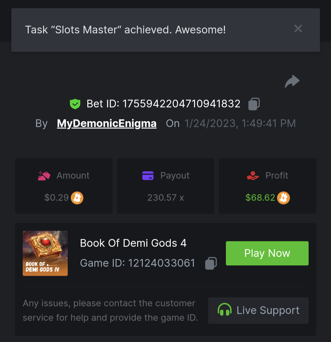 Book of Wolves - Full Moon - 200x @ $0.10 Betting ID: 1732512565935034631 Egyptian Ways - 310x @ $1.40 Bet ID: #1732213992274750592 Book of Rampage - 195x @ $1.50 Bet ID: #1732025723007842311 ($1.50 @ 195x) Book of Rampage - 113x @ $1.50 Betting ID: 1732026516742468224 -