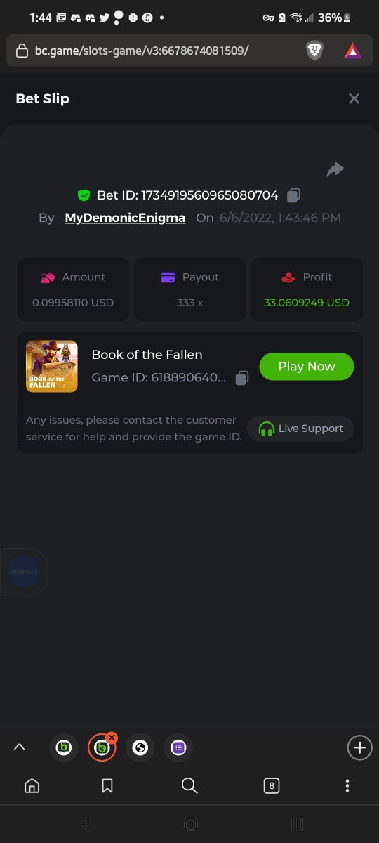 Book of Muertos [239.5x] https://bc.game/#/sd/10WHW66LMPRR4J Book of Skulls [261.5x] https://bc.game/#/sd/10WI1SFW0GWTN7 Origin of Lilith [200x] https://bc.game/#/sd/10WJ3TU4VRHSSZ -