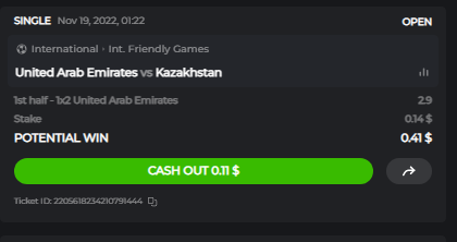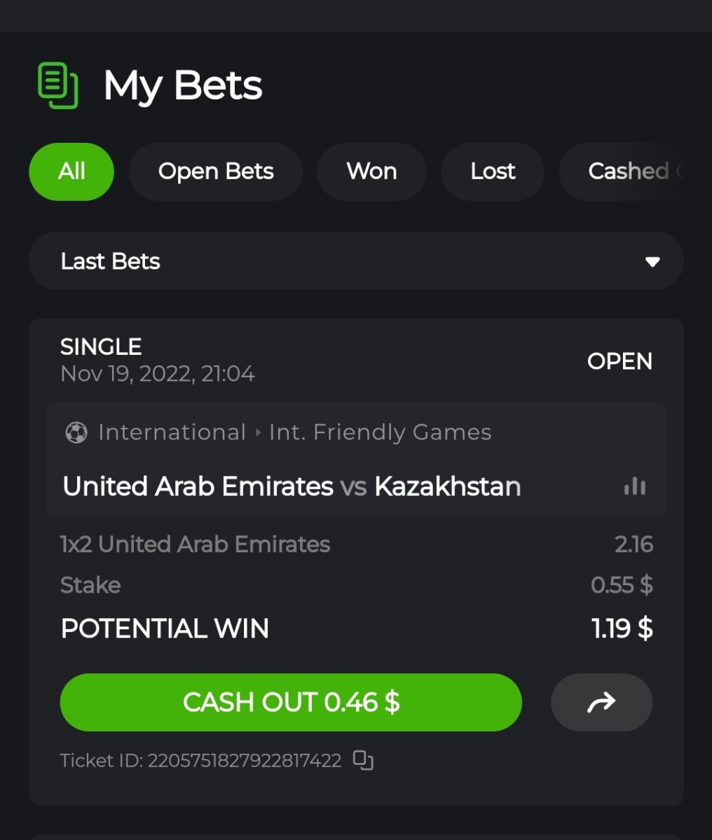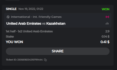 Tato_123 Posted November 20, 2022 Author Share Posted November 20, 2022 results United Arab Emirates vs Kazakhstan 2-1 @MLB odds 2.9 stake 0.14$ @Superbet odds 2.16 stake 0.55$ @Unbaeten odds 2.12 stake 5.1$ price 1) 6$ 2) 4$ 3) 3$ Link to comment Share on other sites More sharing options...