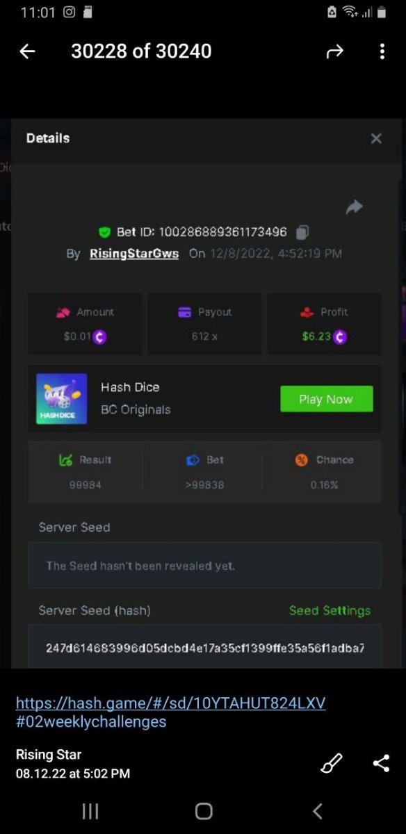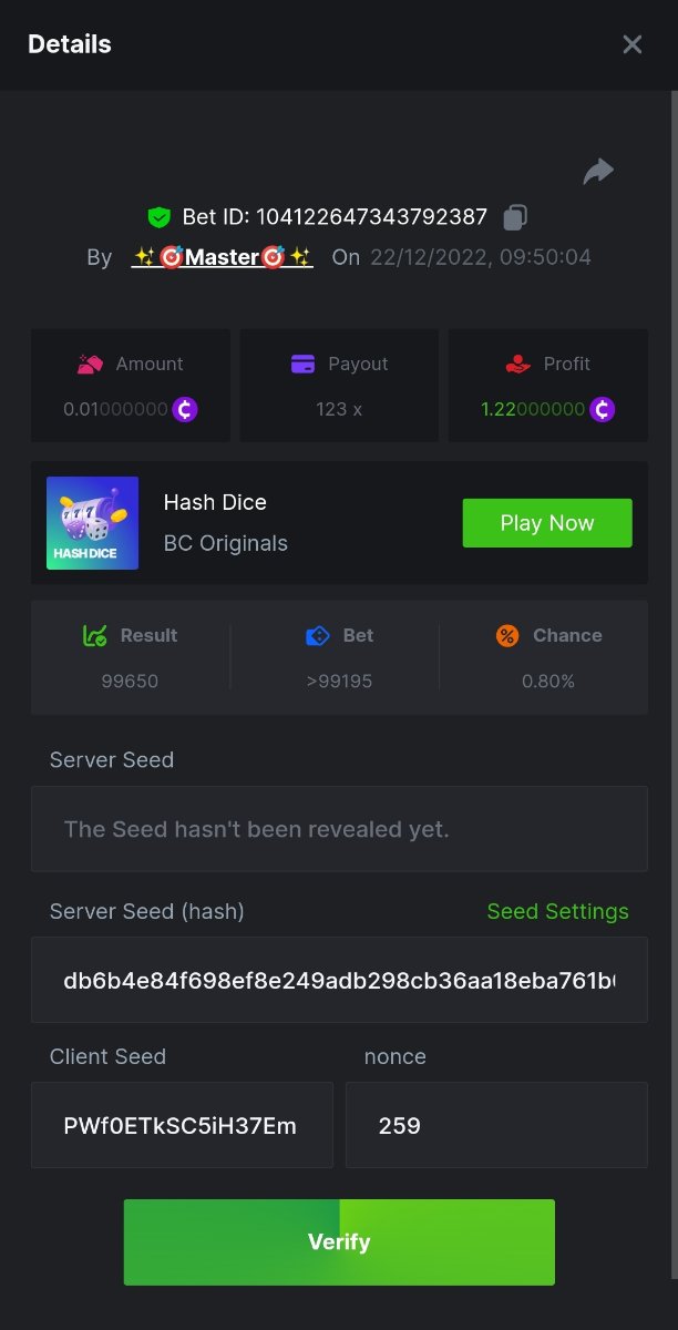 Black Tiger Posted December 22, 2022 Share Posted December 22, 2022 Read Carefully Before Start To Hunt Daily Challenges #107 : HASH DICEHunt :Win the highest pay outMin Payout requirement 100xMin Level 4️Duration Starting : Now End time : 23.59 UTC Time How to Join? Make screenshot + paste your bet link + UID or Profile links Mini bet amount - 0.01$ Any coin allowedReward Prizes 1st Place....... $7 BCD2nd Place..... $5 BCD3rd Place...... $4 BCD 🎖4th Place......$3 BCD5th - 10th Place......$1 BCD 🏵 Winners will be announcing next day after Roll Point 2 Link to comment Share on other sites More sharing options...