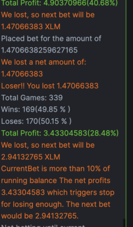 Skele Posted January 28, 2023 Share Posted January 28, 2023 thats because if you look at the code it checks the stoploss such that its (theamountcurrentlyLost+thenextbetamount) > stoploss then stop. The reason for this is well if i only want to lost 10$ and i start betting at 20$ i d9on't expect it to let me risk more than i am willing to lose. Martingale in general is not a sustainable strategy. You will have better success with doing something like hunting 10x with a 12% increase on loss, but only starting to bet after you have seen 20 or 30 red games in a row, or something of that nature. But even there if you look at the stats, most of the time its going to hit before the first 20 games, which is fine, but you also have some run away red streaks where it may go 70 games before hitting a 10x. Personally i prefer limbo because its faster and although you can't skip games there you can min bet instead which is almost the same thing, then only bet on games that have a higher probability of being winning games. Because it is so much faster than crash you also start to see little patterns that can sometimes be used to your advantage like a good portion of the time 10x games seem to come in clusters. etc.. As far as my socials go my TG is https://t.me/Skele69 and my discord is skele69#6388 I don't monitor the forums much because i get a bunch of spam emails from the 2$ shit links for everyone scammer. So i just started ignoring all of them. Link to comment Share on other sites More sharing options...