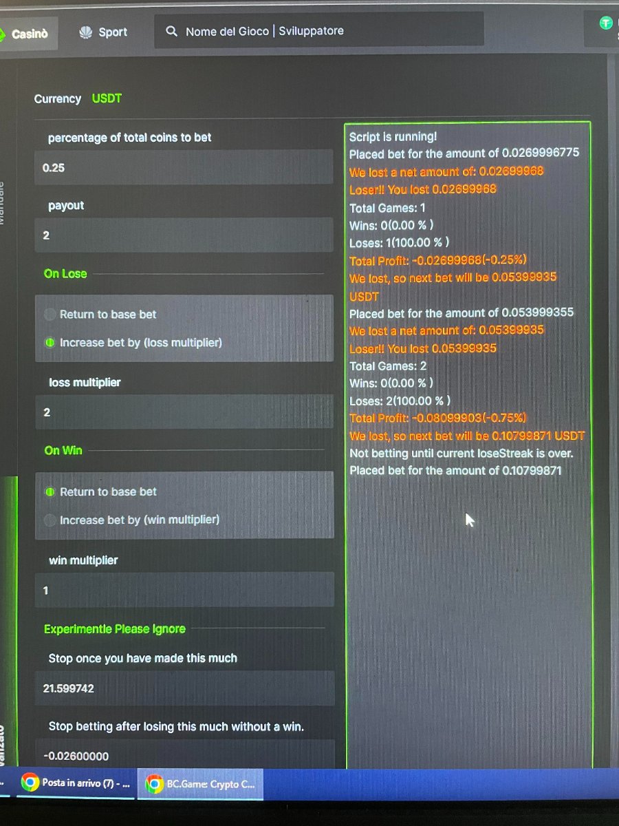 Cristian2 Posted January 26, 2023 Author Share Posted January 26, 2023 8 minutes ago, Skele said: oh and i checked and it is just a placement of the logs issue it isn't actually betting just move this line: log.info('Placed bet for the amount of ' + currentBet); to be just above the bet and delow the stopwin check like so: if(netProfit > stopWinAmount) { log.info('Stopping because we made enough.') game.stop(); } log.info('Placed bet for the amount of ' + currentBet); game.bet(currentBet, config.payout.value).then(function (payout) { if you want it to always remain 1 then you can just calc it at the start and put it into the stopafterlossingthis much without a win if you are going for 10% its super simple just take your balance and shift the decimal one place to the left and your done. I HAVE NOTICED THAT IN ABOUT 6H IF ALL GOES WELL YOU HAVE A 100% RETURN, CAN YOU INSERT A FUNCTION THAT AS SOON AS THE SCRIPT HAS BEEN EXECUTING FOR 6H DOES IT STOP? Link to comment Share on other sites More sharing options...